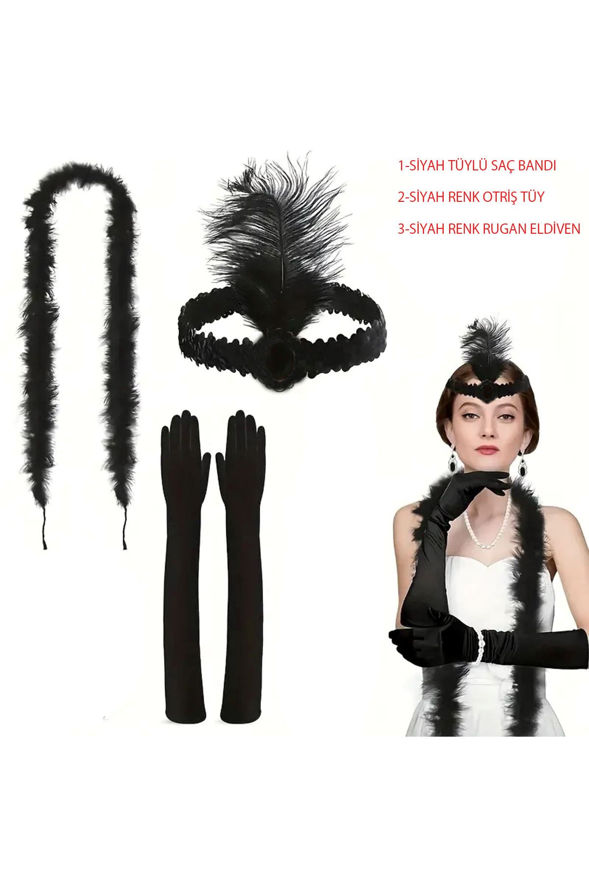 1920’LER TARZI SİYAH TÜYLÜ SAÇ BANDI, RUGAN SİYAH ELDİVEN VE SİYAH OTRİŞ SETİÜrün Özellikleri 1920’ler tarzı siyah tüylü saç bandı, rugan siyah eldiven ve siyah otriş seti, nostaljik ve zarif görünümüyle özel günlerde dikkat çekici bir stil oluşturur. Esnek yapıya sahip tüylü saç bandı, başa rahatça oturur ve tüy detayıyla dönemin karakteristik havasını yansıtır. Rugan siyah eldivenler parlak yüzeyiyle şıklık katarken, bileğe kadar uzanan formuyla zarafeti tamamlar. Hafif ve kabarık dokulu siyah otriş ise kostüme hacim ve ihtişam kazandırır. Kostüm partileri, temalı davetler, tiyatro gösterileri veya özel çekimler için idealdir. Dayanıklı malzeme yapısı uzun ömürlü kullanım sunar ve kolay taşınabilir olmasıyla pratik bir set olarak öne çıkar. Paket İçeriği 1 adet siyah tüylü saç bandı, 1 çift rugan siyah eldiven, 1 adet siyah otriş