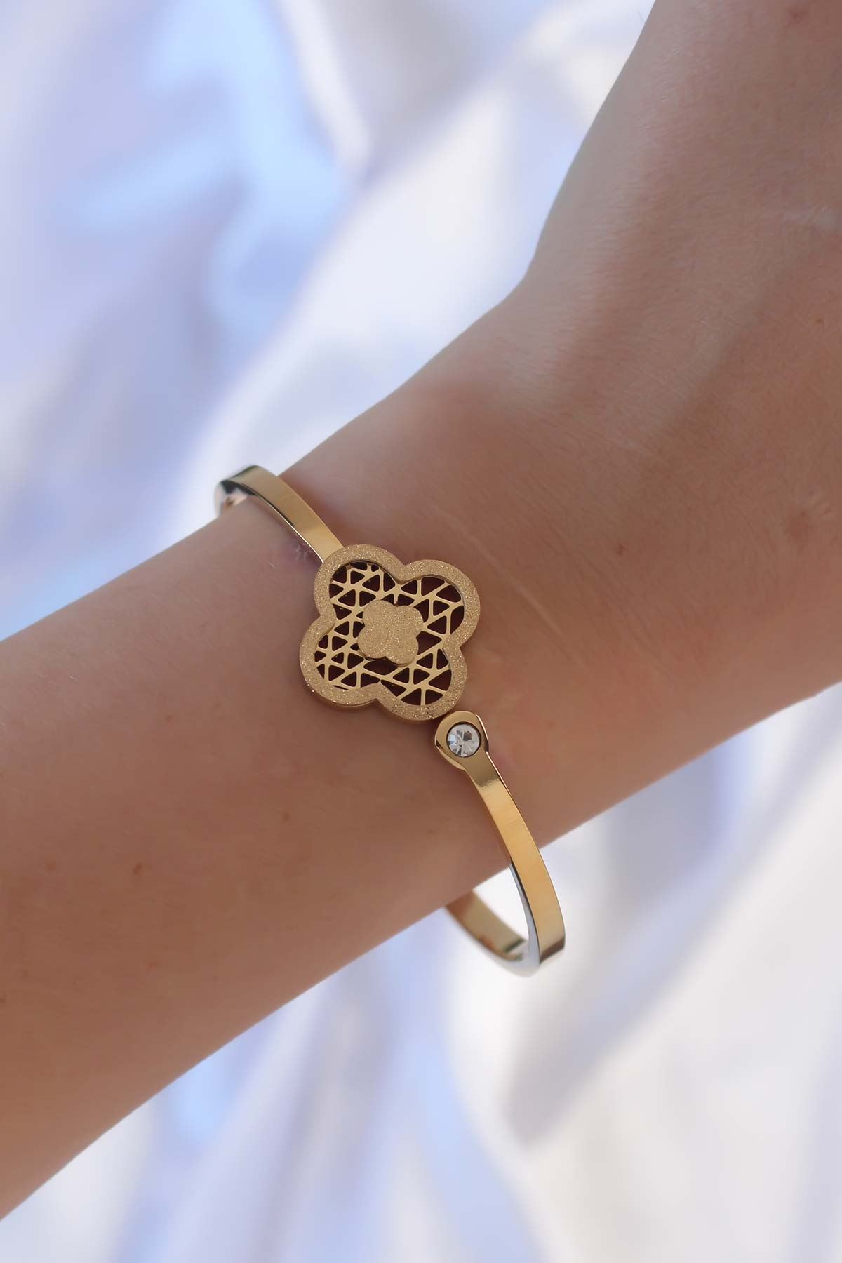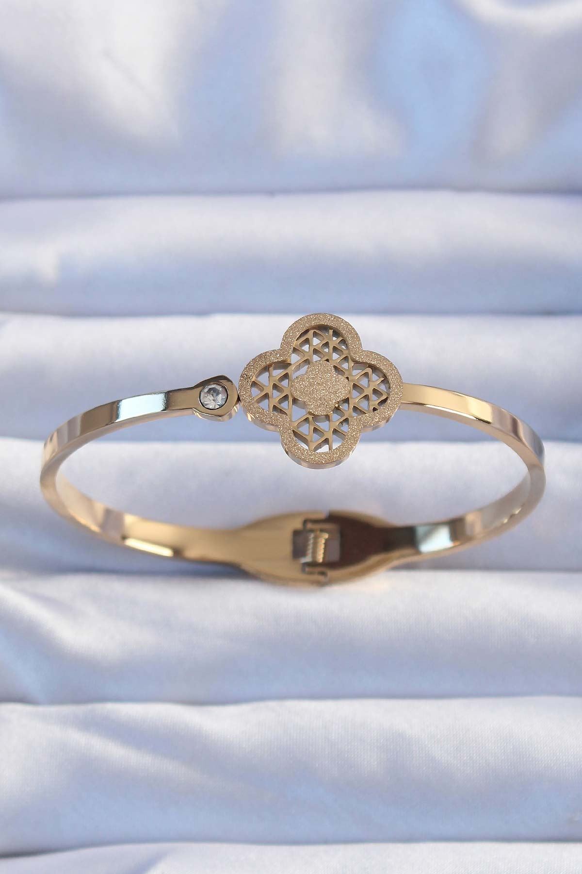 316L Çelik Altın Renk Zirkon Taşlı Simli Yonca Kelepçe - TJ-BB6377