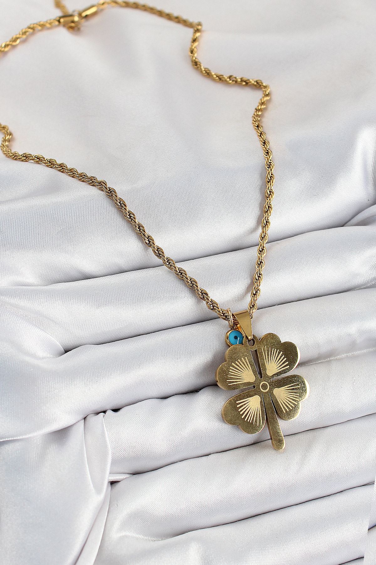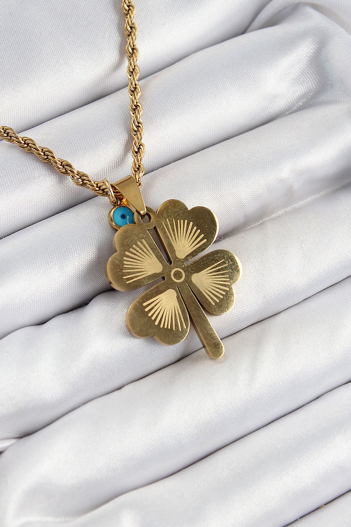 316L Çelik Burgu Zincirli Nazar Detaylı Yonca Model Gold Renk Kadın Kolye - TJ-BKO10377