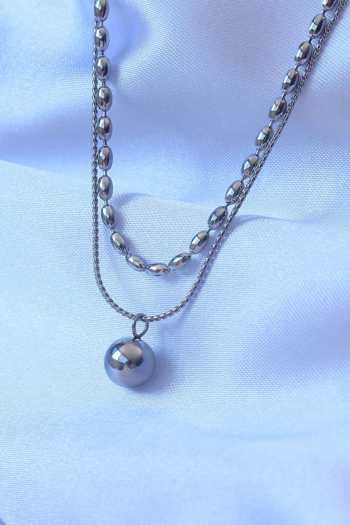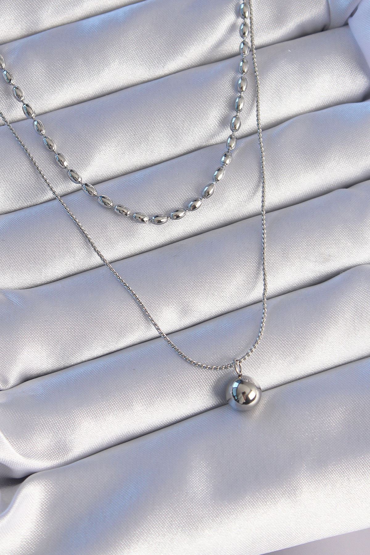 316L Çelik Çift Zincirli Gümüş Renk Topçuk Model Kolye - TJ-BKO8881