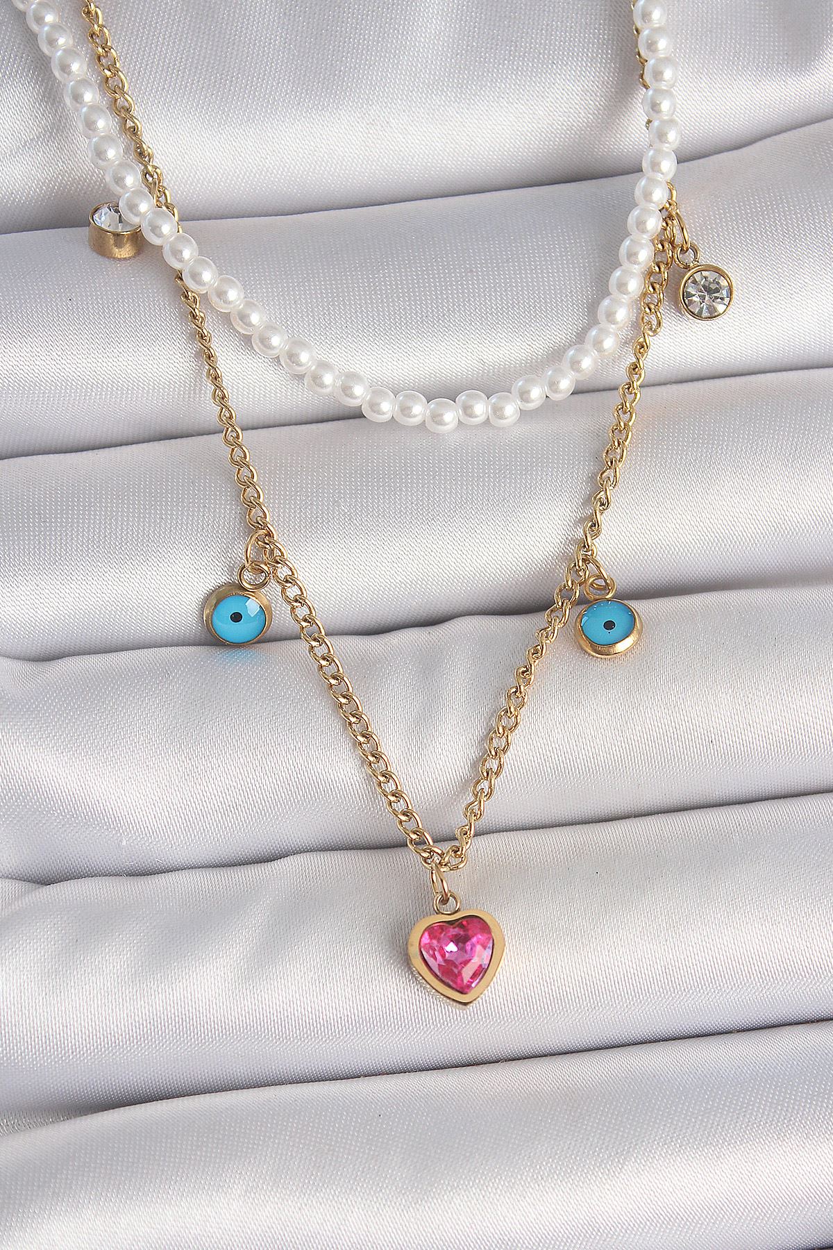 316L Çelik Gold Renk 2'Li İnci Zincir Model Pembe Taşlı Kalp Figür Nazar Boncuk Detay Kadın Kolye - TJ-BKO10112