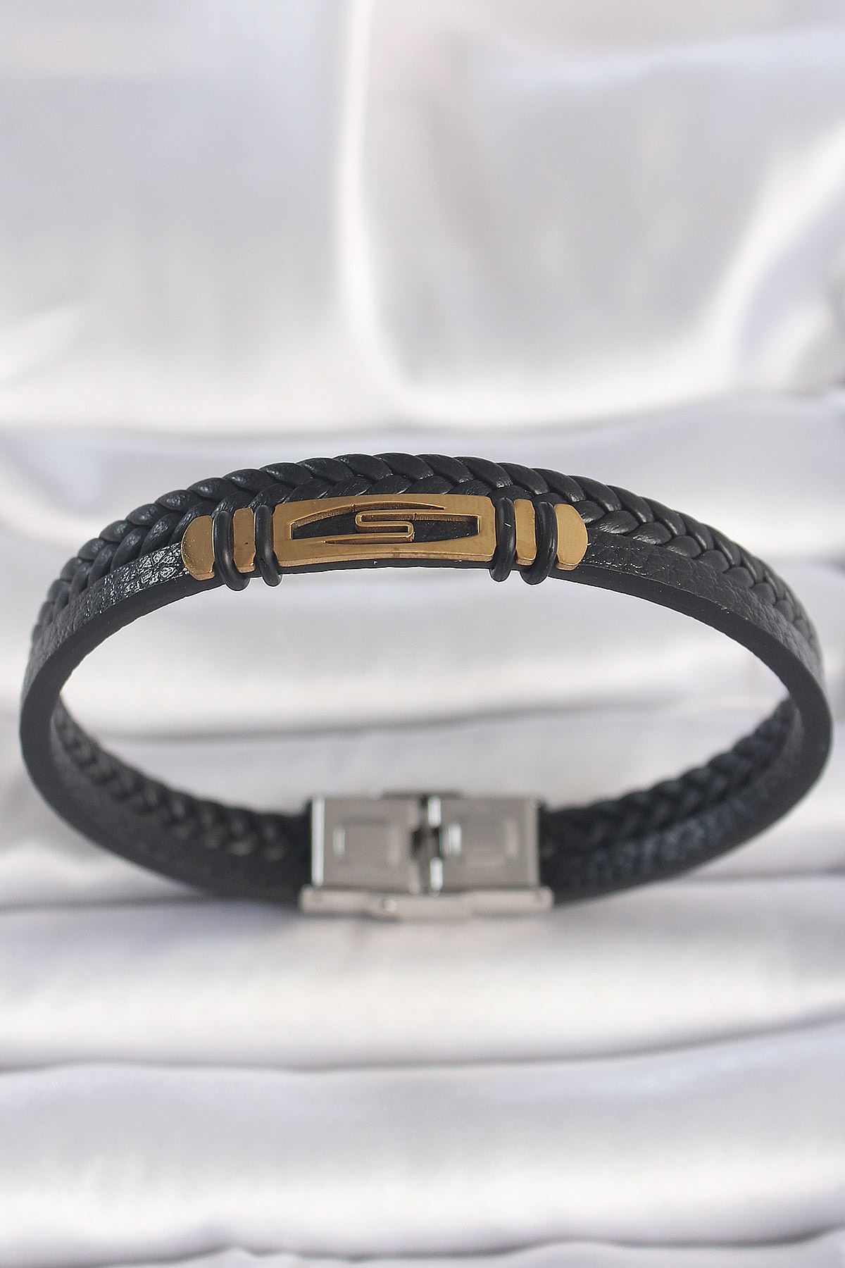 316L Çelik Gold Renk Aksesuarlı Çift Sıra Siyah Burgu Desenli Deri Kordon Erkek Bileklik - TJ-EB3708