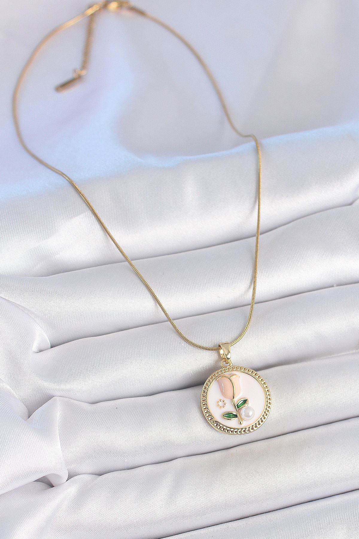 316L Çelik Gold Renk Beyaz Mineli İncili Çiçek İşlemeli Portre Model Kadın Kolye - TJ-BKO10180