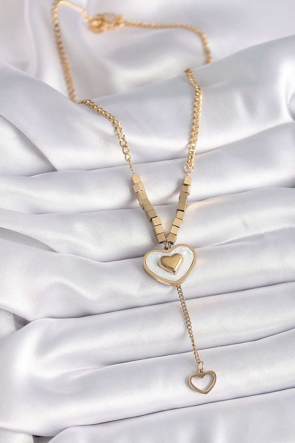 316L Çelik Gold Renk Beyaz Sedefli Kalp Model Sallantı Detay Kadın Kolye - TJ-BKO9407