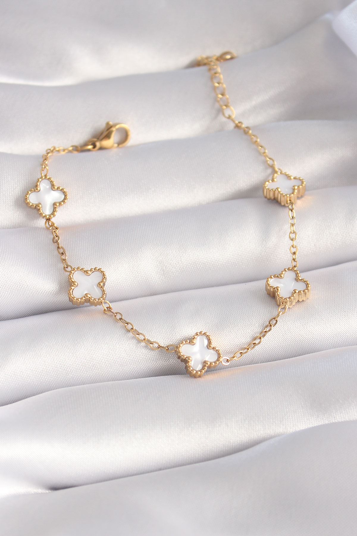 316L Çelik Gold Renk Beyaz Yonca Model Kadın Bileklik - TJ-BB5963