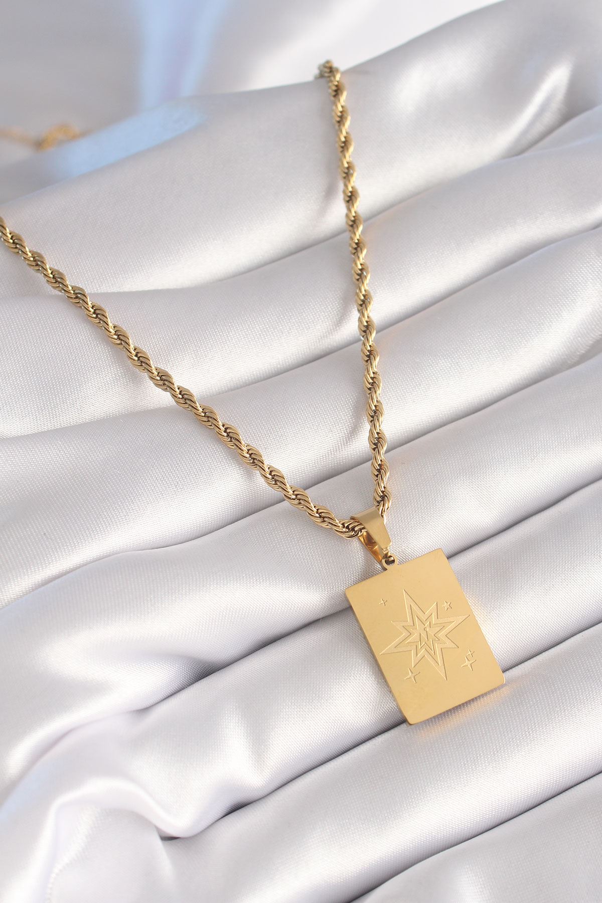 316L Çelik Gold Renk Burgu Zincir Kutup Yıldızı İşleme Plaka Figür Kadın Kolye - TJ-BKO8451