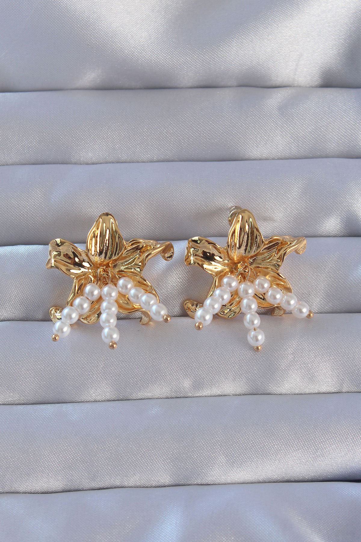 316L Çelik Gold Renk İnci Aksesuarlı Çiçek Model Küpe - TJ-BKP9108
