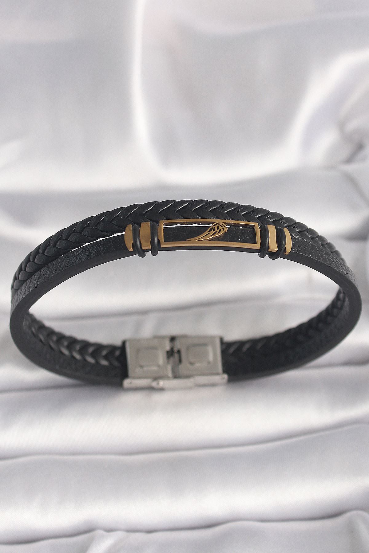 316L Çelik Gold Renk Kanat Aksesuarlı Siyah Burgu Model Deri Kordon Erkek Bileklik - TJ-EB3703