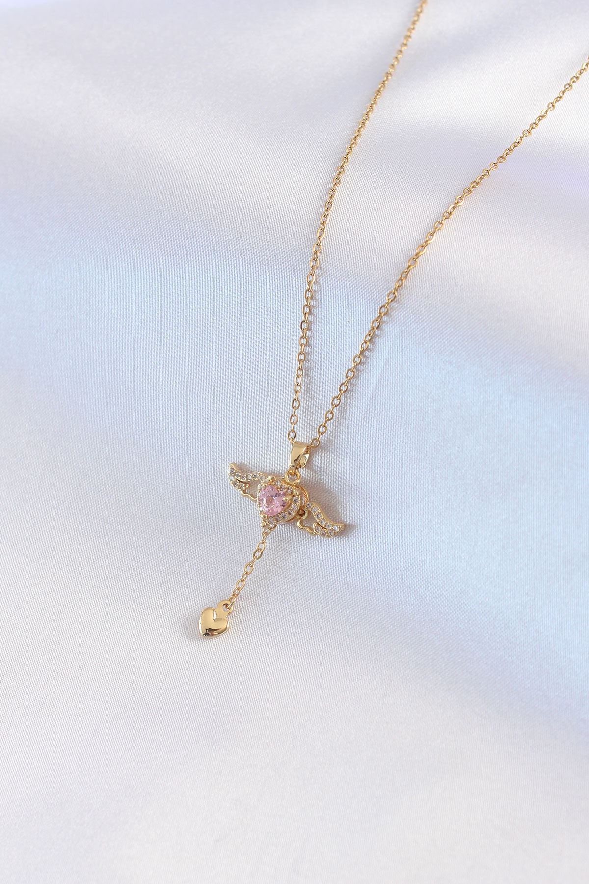 316L Çelik Gold Renk Kanatlı Kalp Model Zirkon Taş Detay Kadın Kolye - TJ-BKO7411