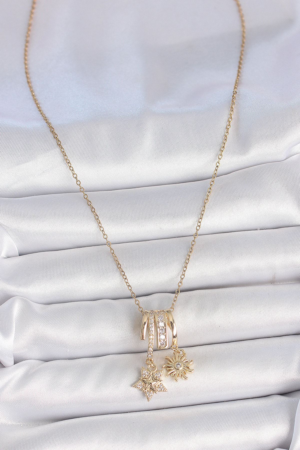 316L Çelik Gold Renk Sallantı Zirkon Taşlı Yıldız Güneş Figür Charm Kadın Kolye - TJ-BKO10100