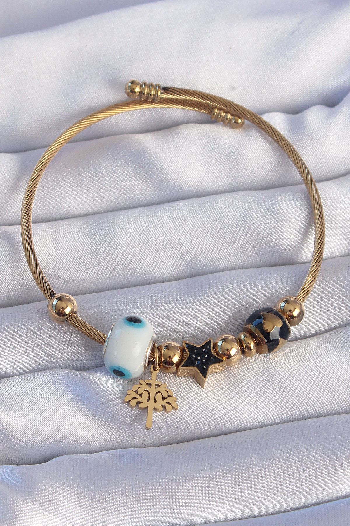 316L Çelik Gold Renk Siyah Zirkon Taşlı Yıldız Tasarımlı Ağaç Detay Nazarlı Charm Bileklik - TJ-BB6197
