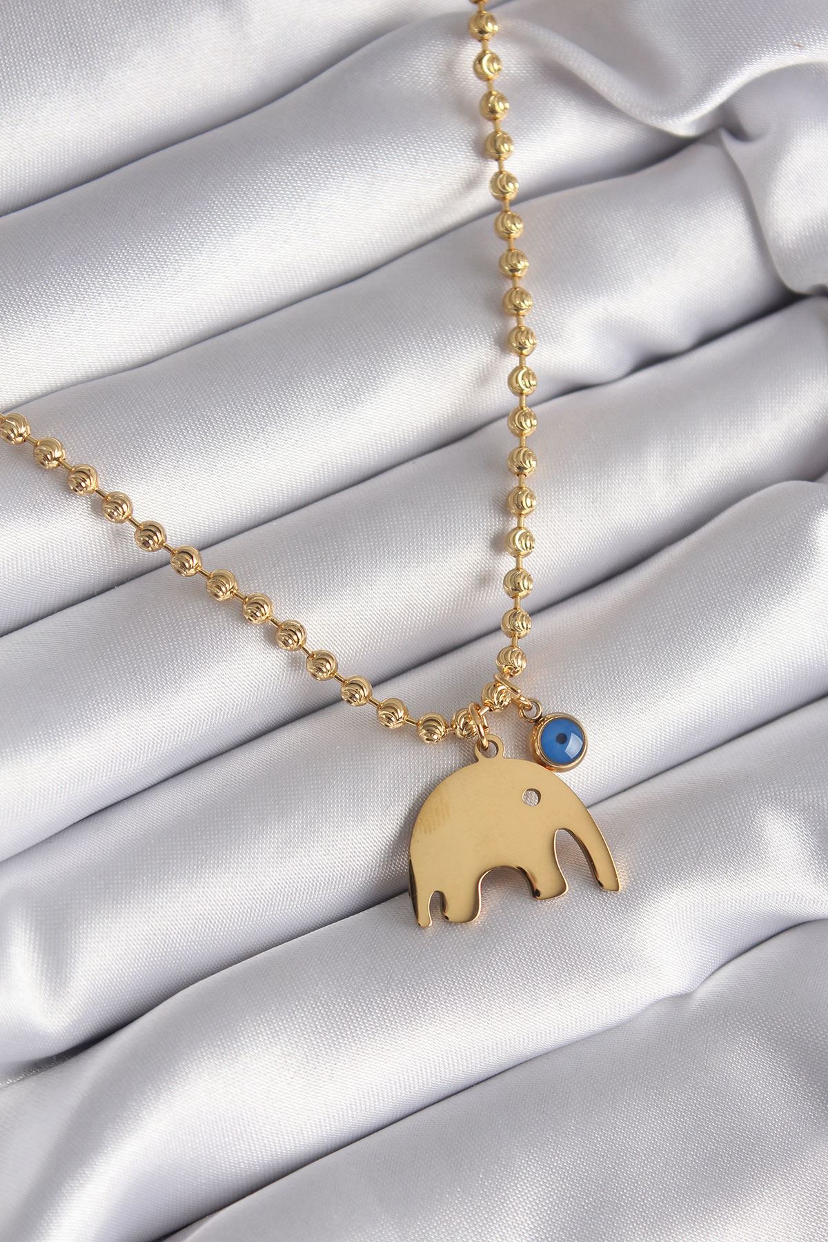 316L Çelik Gold Renk Top Zincir Model Fil Figür Nazar Boncuk Detay Kadın Kolye - TJ-BKO8342