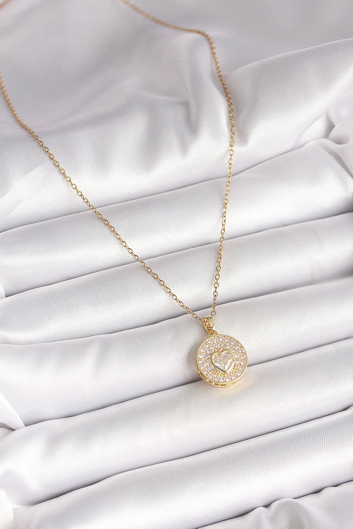 316L Çelik Gold Renk Zincir Madalyon Zirkon Taşlı Kalp Model Kadın Kolye - TJ-BKO9946