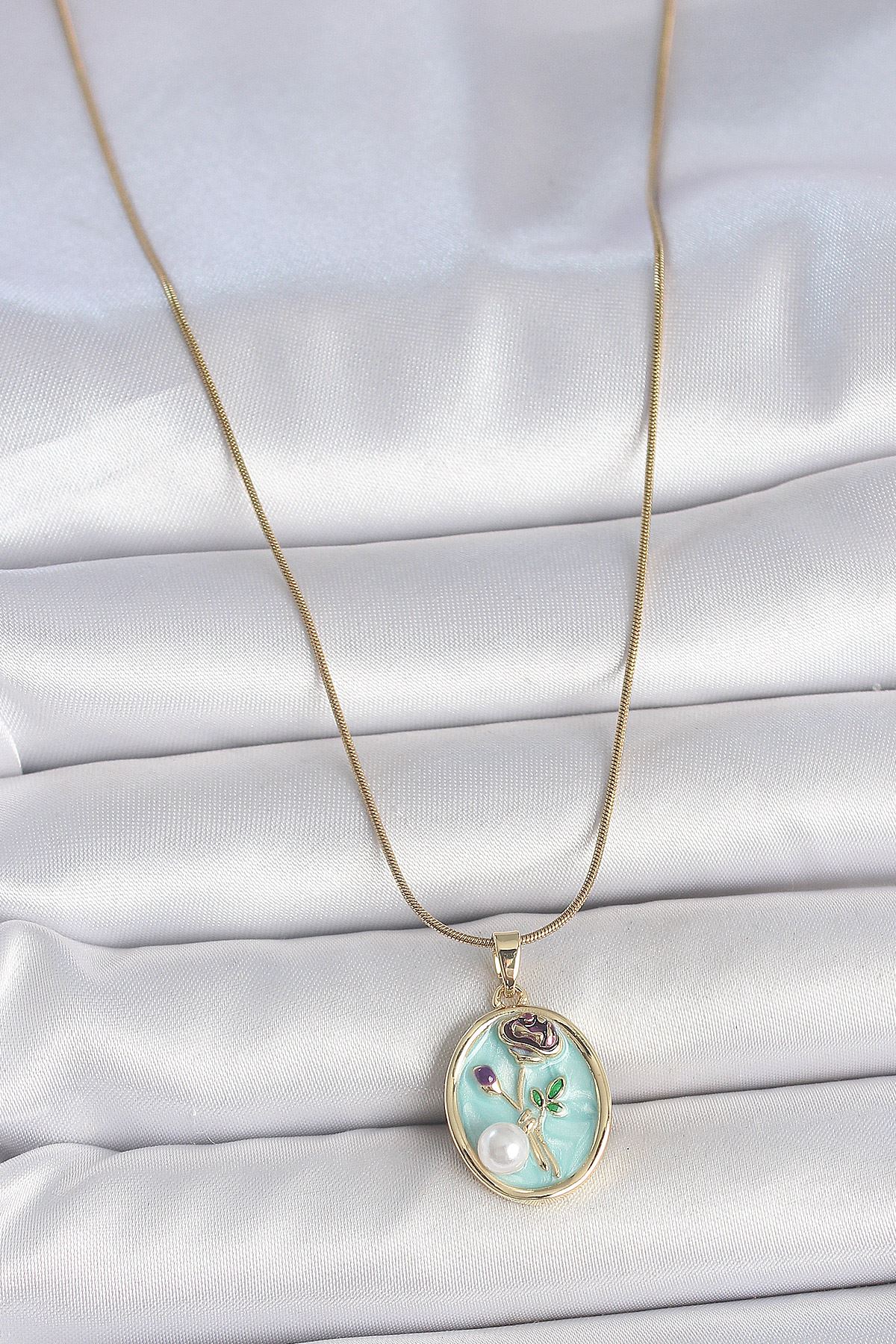 316L Çelik Gold Renk Zincir Mavi Çiçek İşlemeli İnci Detay Portre Model Kadın Kolye - TJ-BKO10076