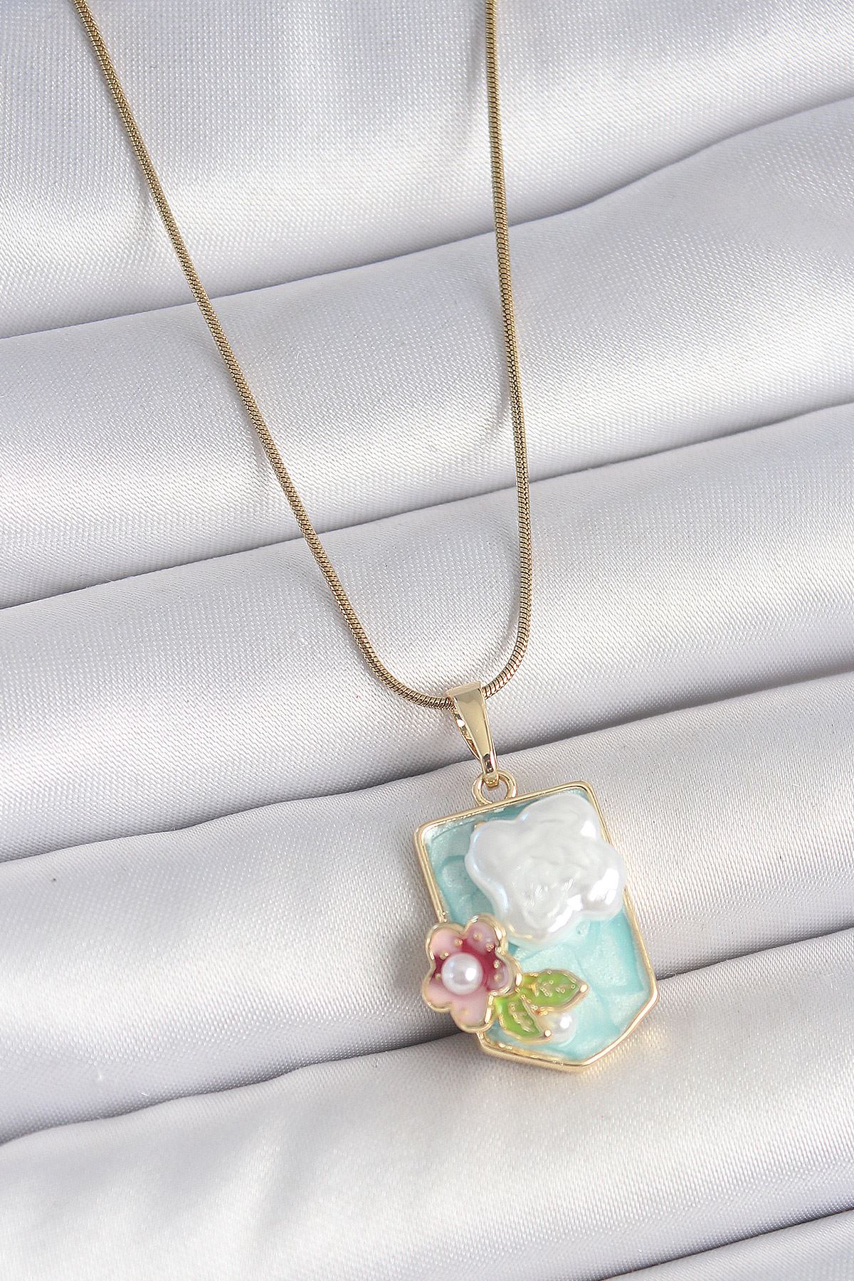 316L Çelik Gold Renk Zincir Turkuaz Mineli Çiçek İşlemeli Portre Model Kadın Kolye - TJ-BKO10166