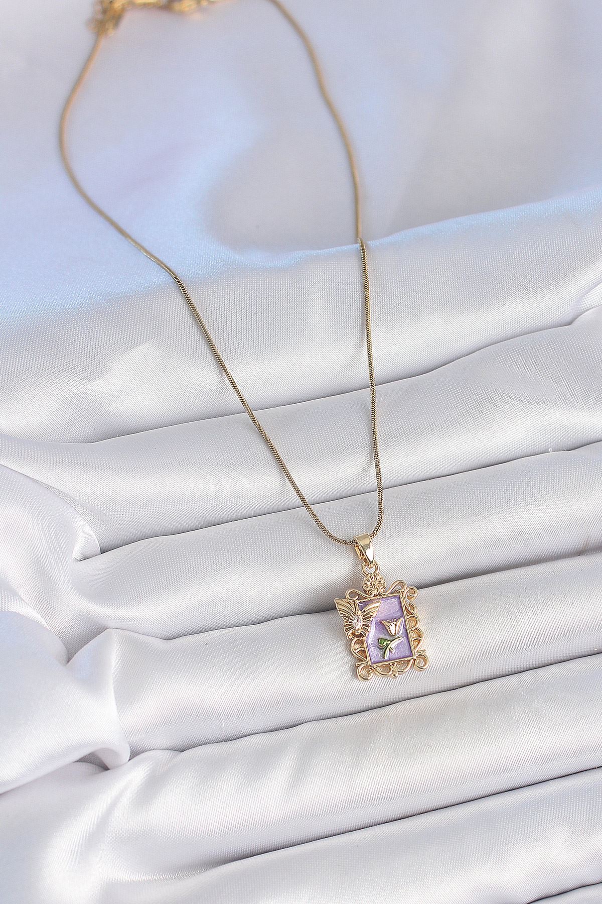 316L Çelik Gold Renk Zincir Mor Renkli Çiçek İşlemeli İnci Detay Portre Model Kadın Kolye - TJ-BKO10074