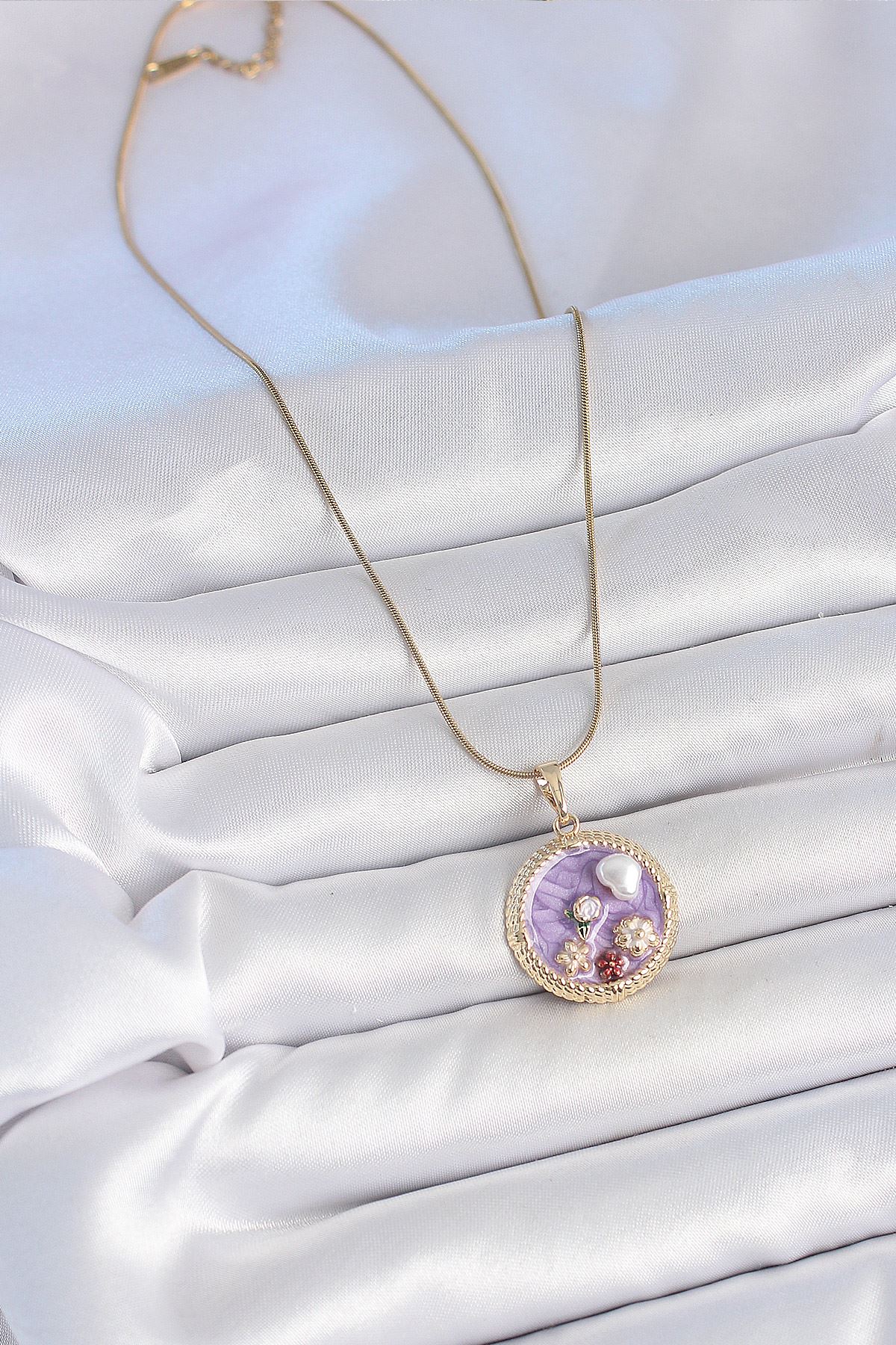 316L Çelik Gold Renk Zincir Mor Mineli İncili Çiçek İşlemeli Madalyon Model Kadın Kolye - TJ-BKO10175