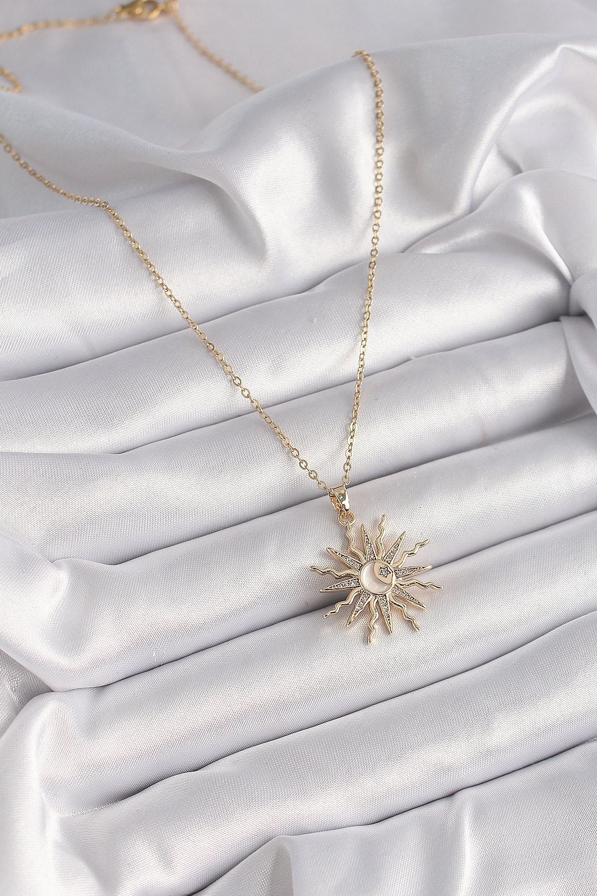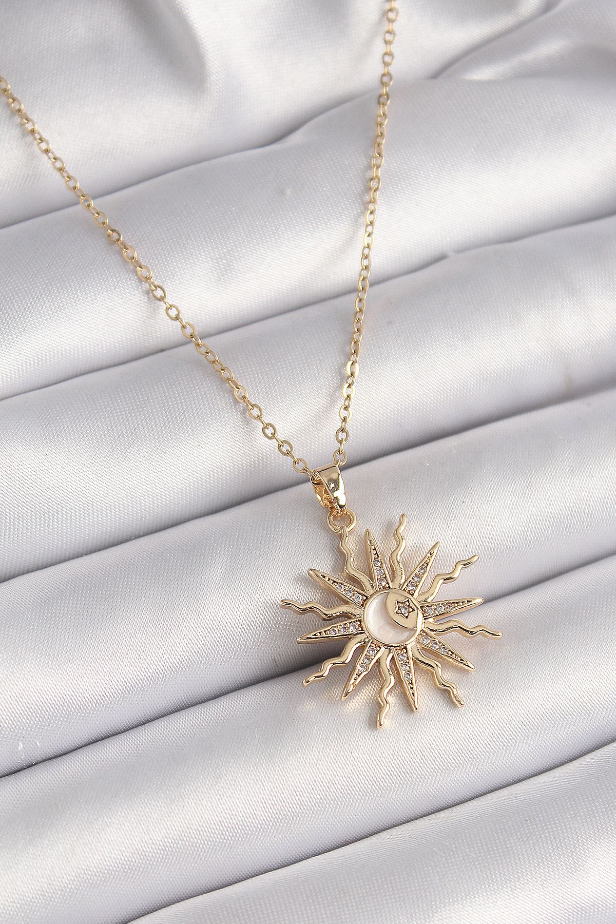 316L Çelik Gold Renk Zincir Renkli Zirkon Taşlı Sedefli Ay İşleme Detay Kadın Kolye - TJ-BKO9630