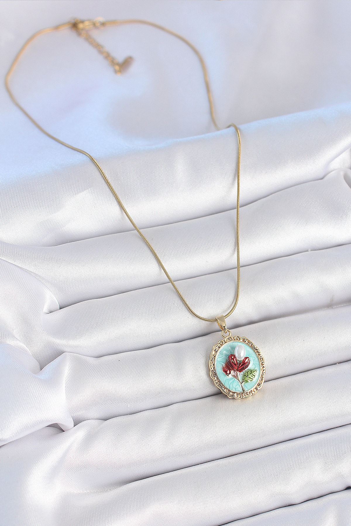 316L Çelik Gold Renk Zincir Turkuaz Mineli İncili Çiçek İşlemeli Portre Model Kadın Kolye - TJ-BKO10157