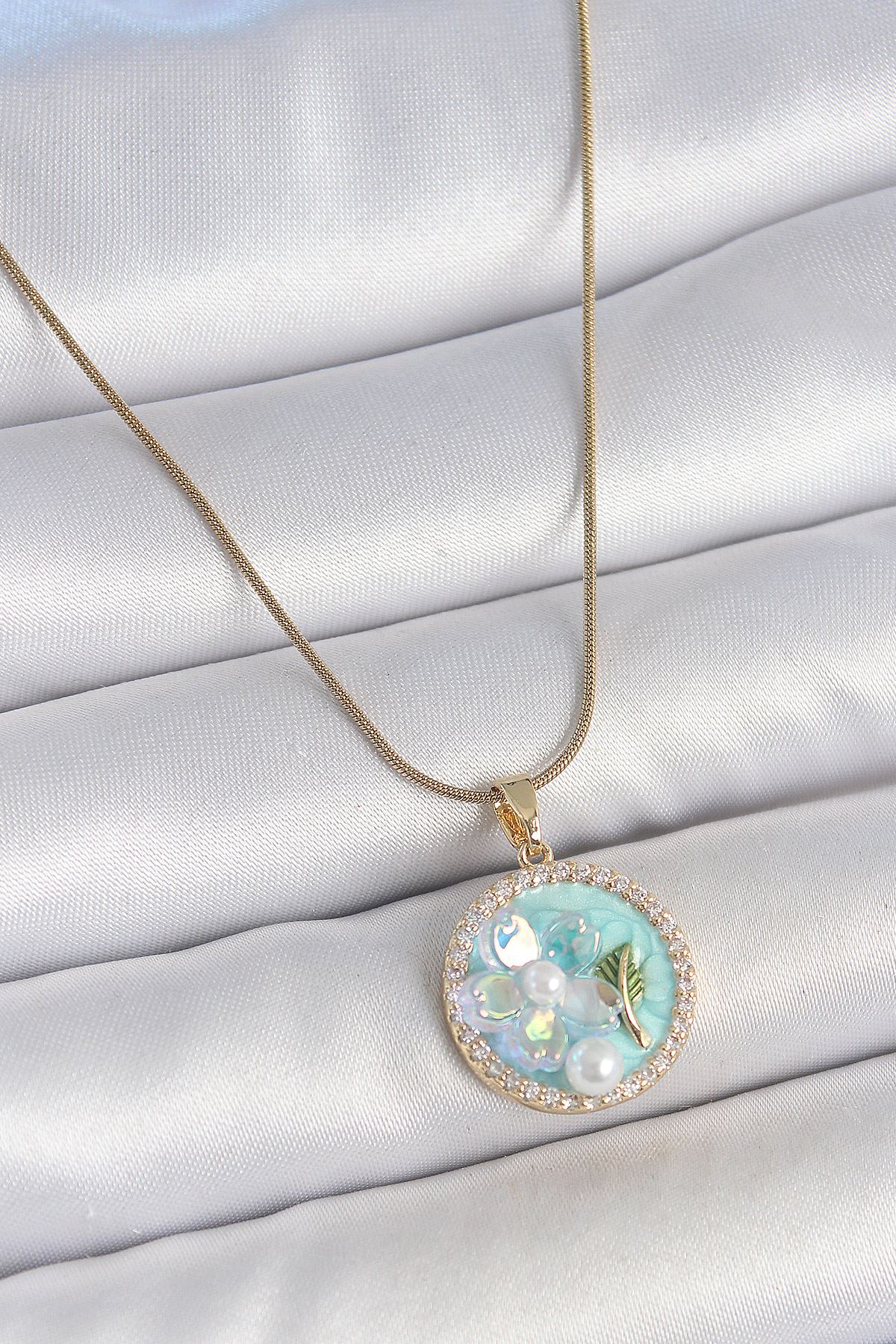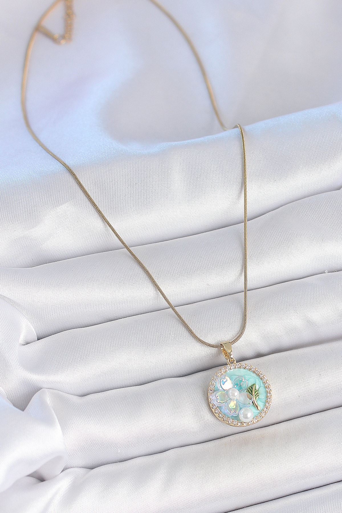 316L Çelik Gold Renk Zincir Zirkon Taş Detaylı Mavi Mineli Çiçek İşlemeli İnci Detay Kadın Kolye - TJ-BKO10137
