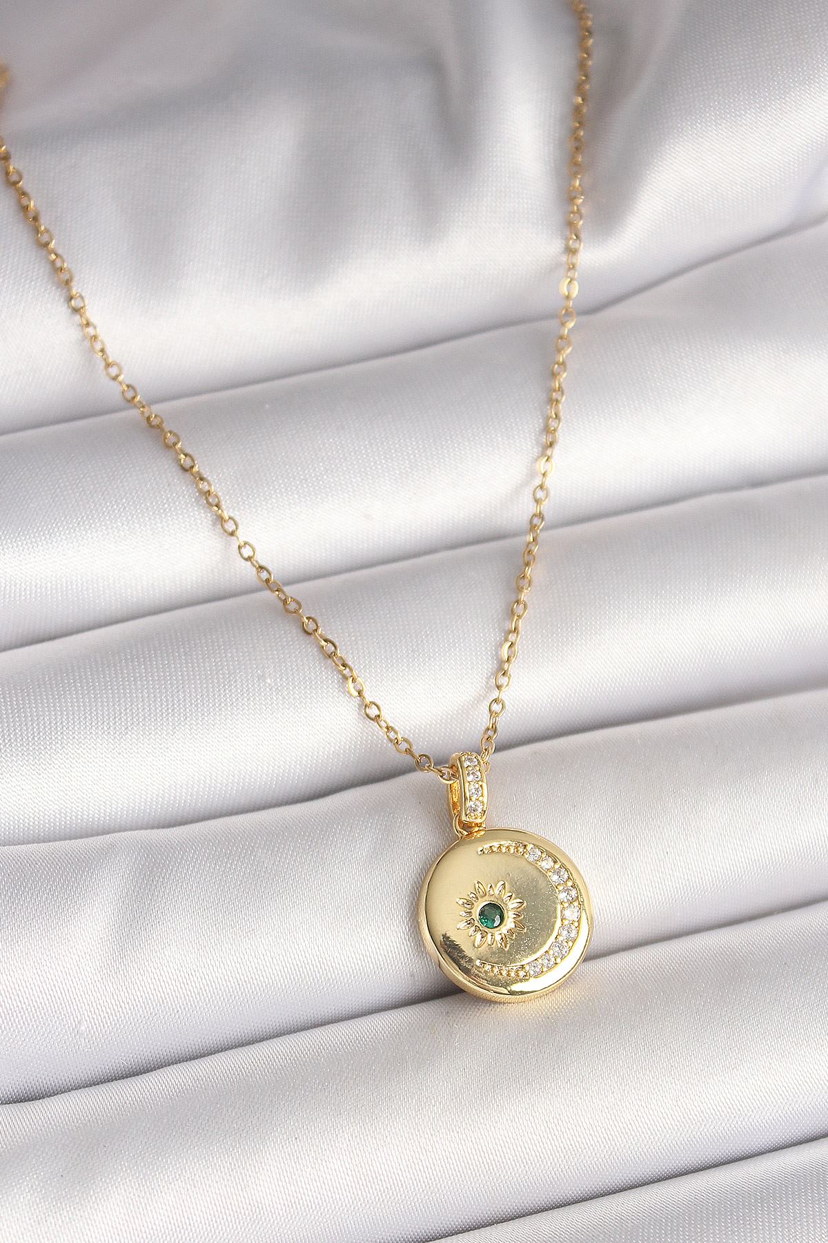 316L Çelik Gümüş Renk Zincir Zirkon Taşlı Ay Güneş İşlemeli Madalyon Model Kadın Kolye - TJ-BKO9959