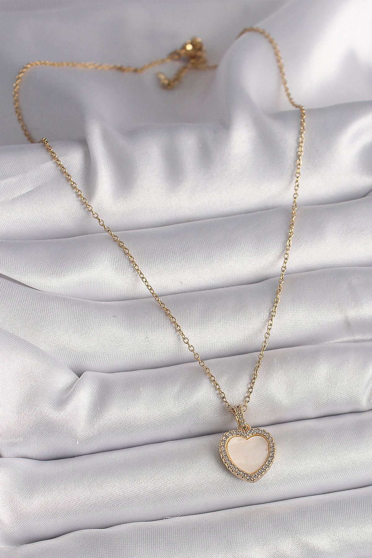 316L Çelik Gold Renk Zincir Zirkon Taşlı Beyaz Mineli Kalp Model Kadın Kolye - TJ-BKO9780