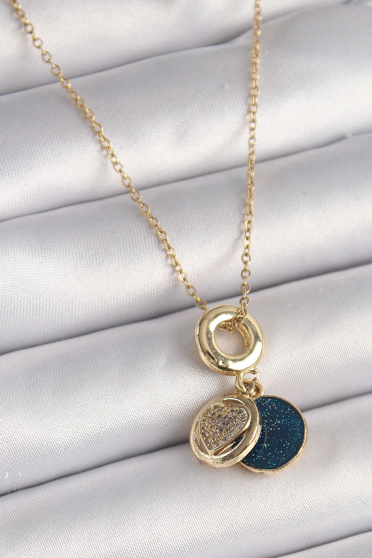 316L Çelik Gold Renk Zincir Zirkon Taşlı Kalp Model Mavi Simli Kadın Kolye - TJ-BKO9640