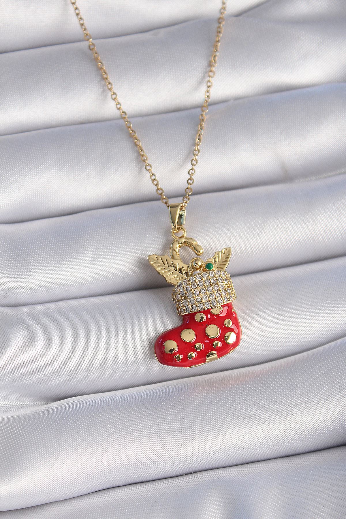 316L Çelik Gold Renk Zincir Zirkon Taşlı Kırmızı Yılbaşı Çorabı Figür Yaprak Detay Kadın Kolye - TJ-BKO9440