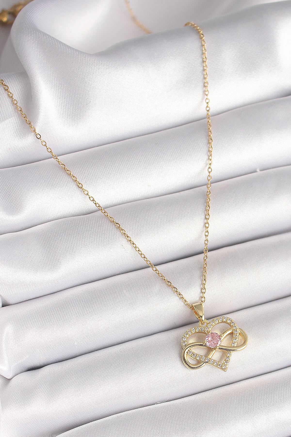 316L Çelik Gold Renk Zincir Zirkon Taşlı Sonsuzluk Kalp Model Kadın Kolye - TJ-BKO9865