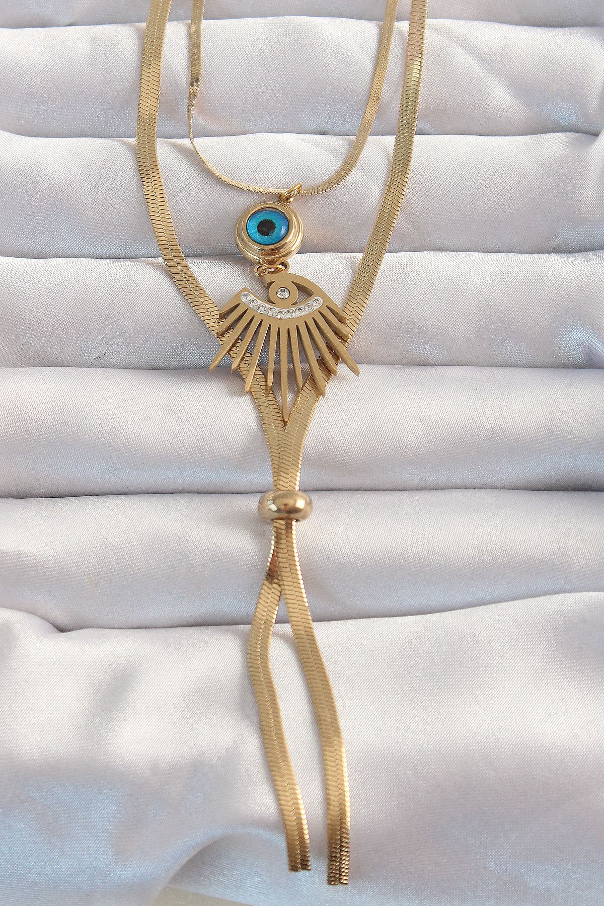 316L Çelik Gold Renk Zirkon Taşlı Göz Detay Nazarlı Uzun Asansör Model Kolye - TJ-BKO8962