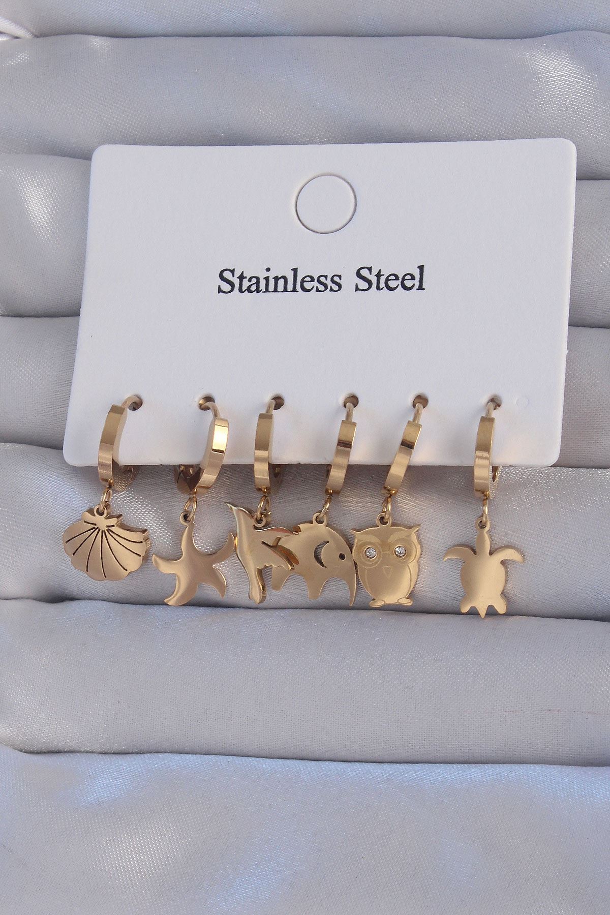 316L Çelik Gold Renk Zirkon Taşlı Hayvan Figürlü Deniz Yıldızı Model Halka Küpe Seti - TJ-BKP9155