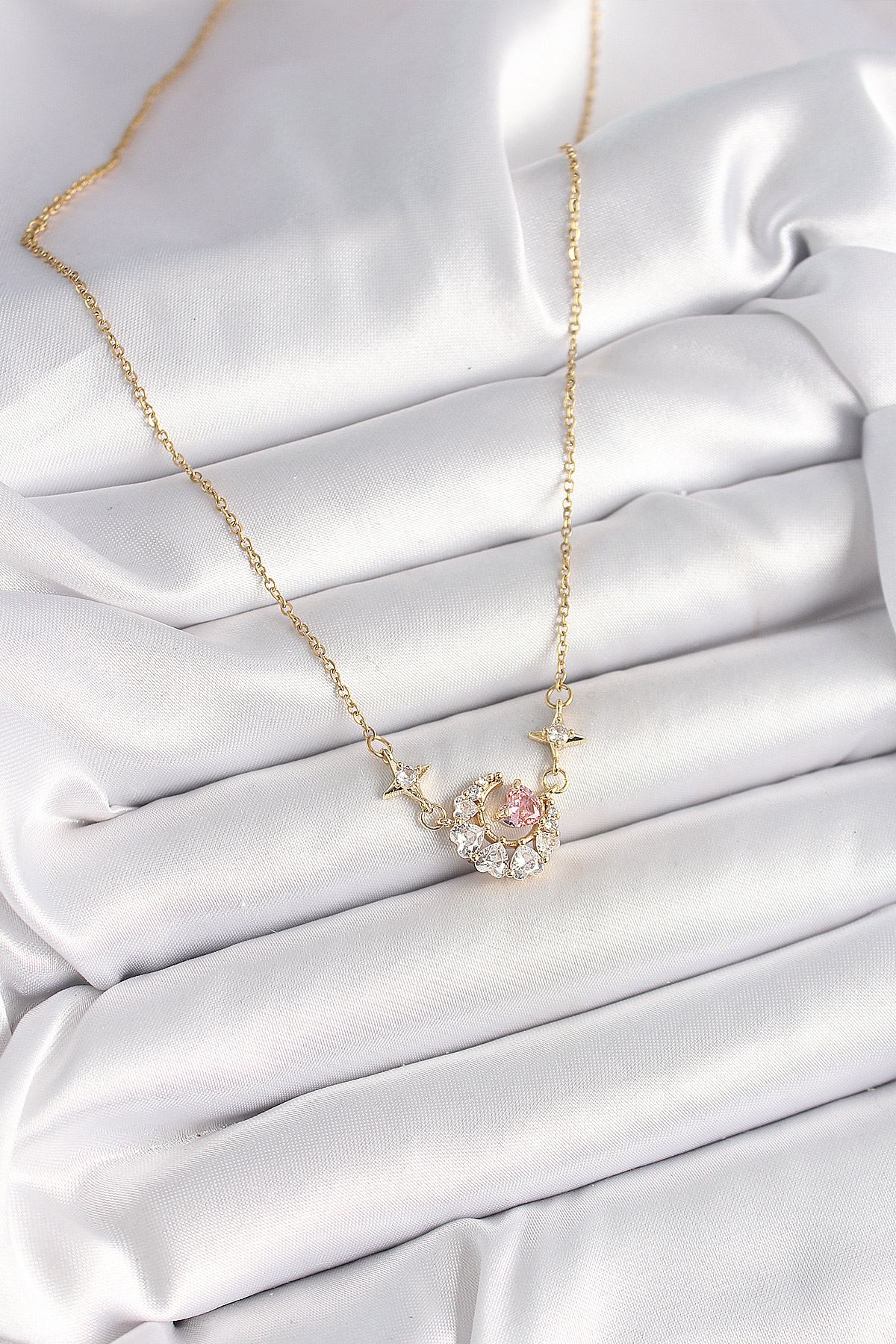316L Çelik Gold Renk Zirkon Taşlı Hilal Pembe Kalp Model Kadın Kolye - TJ-BKO9932