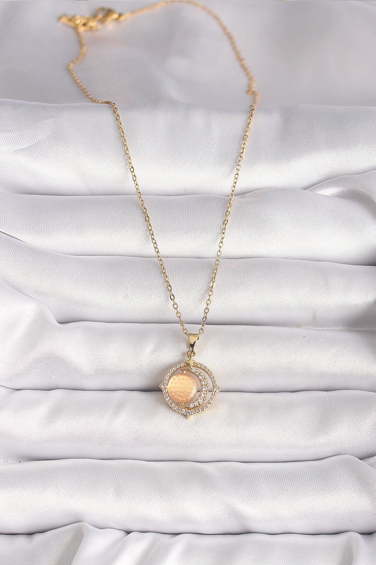 316L Çelik Gold Renk Zirkon Taşlı Turuncu Sedefli Hilal Model Kadın Kolye - TJ-BKO9704