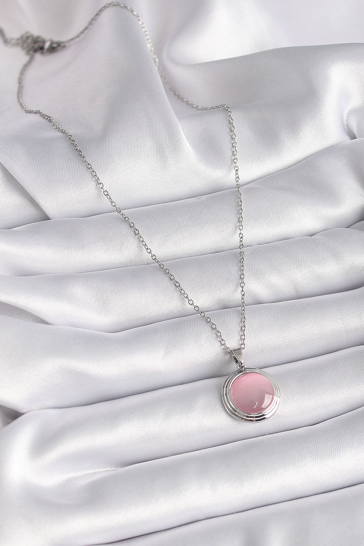 316L Çelik Gümüş Renk Daire Pembe Sedefli Model Kadın Kolye - TJ-BKO9425