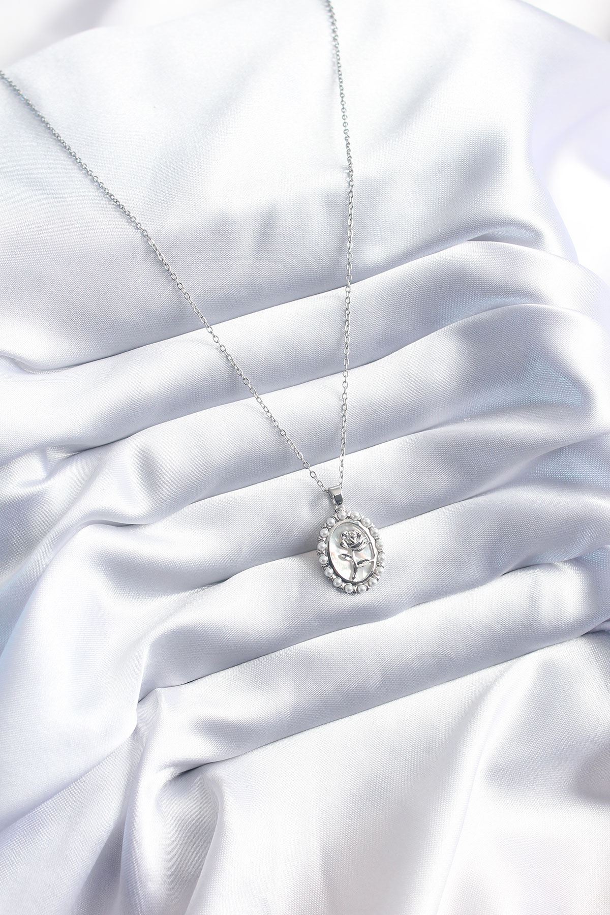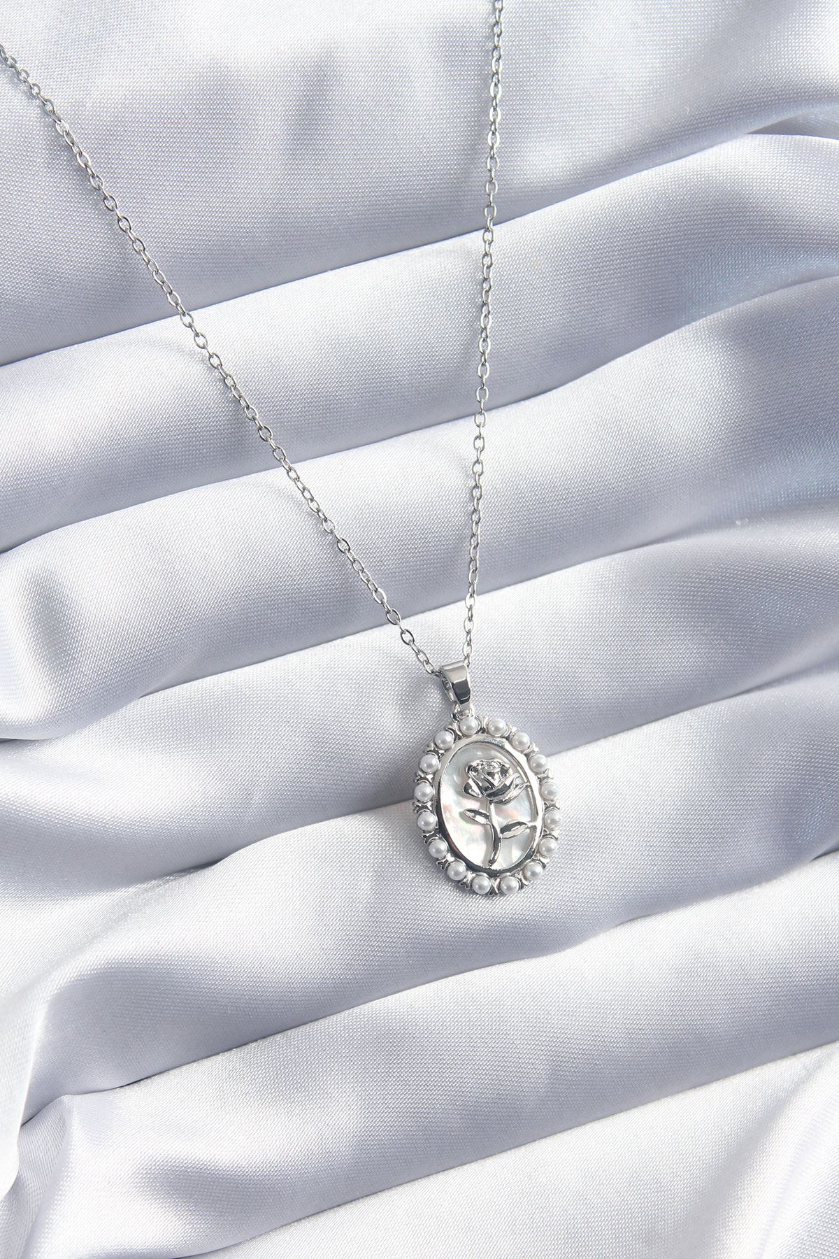 316L Çelik Gümüş Renk Gül Model İnci Detay Kadın Kolye - TJ-BKO8095