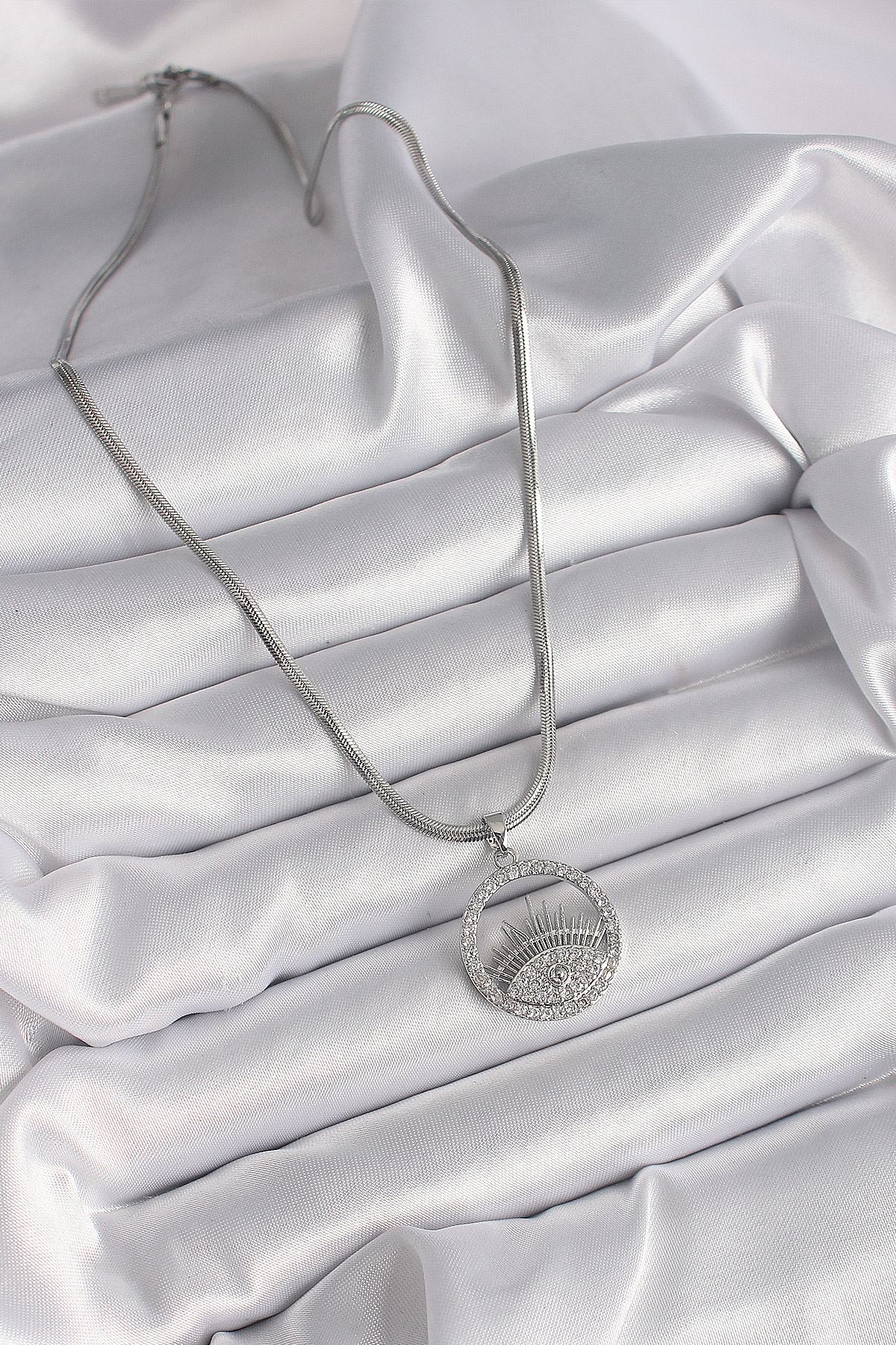 316L Çelik Gümüş Renk İtalyan Zincir Zirkon Taşlı Göz Model Kadın Kolye - TJ-BKO9592