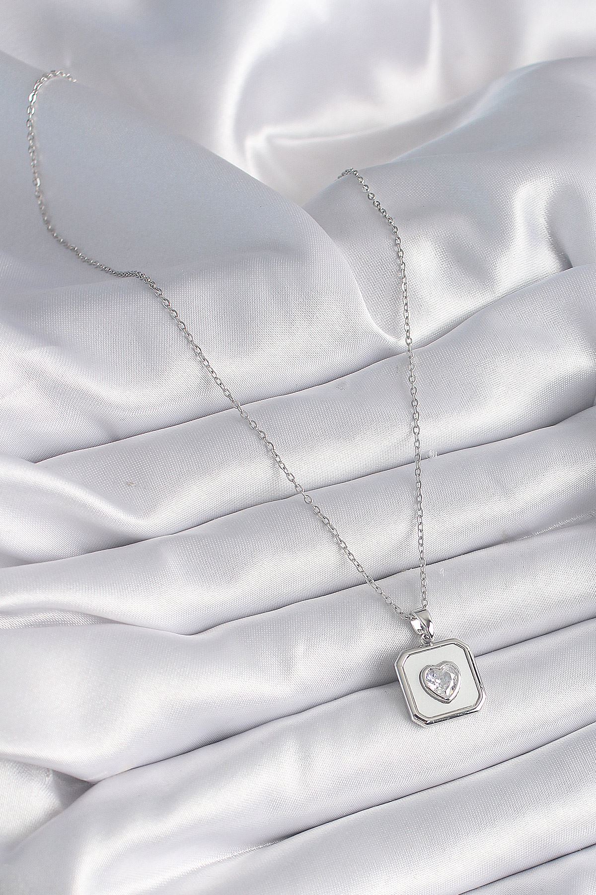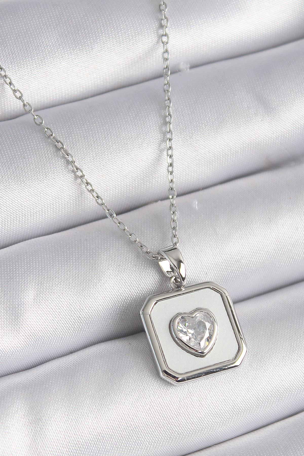 316L Çelik Gümüş Renk Kare Madalyon Kalp Zirkon Taş İşleme Kadın Kolye - TJ-BKO9525