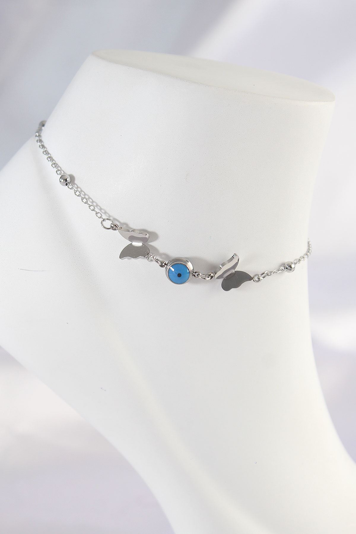 316L Çelik Gümüş Renk Nazar Boncuk Detay Kelebek Halhal - TJ-HH1602