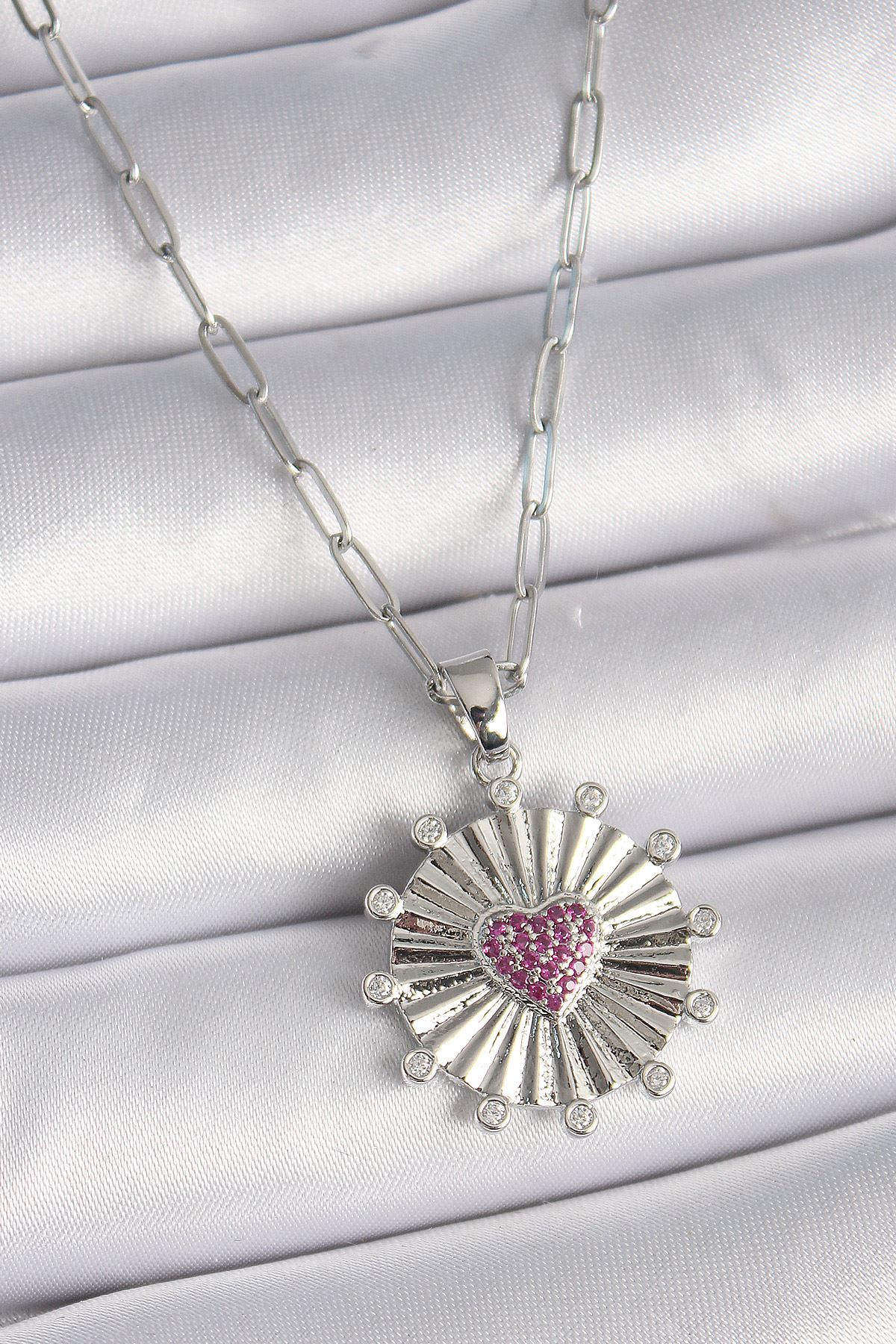 316L Çelik Gümüş Renk Pembe Zirkon Taşlı Kalp İşleme Madalyon Model Kadın Kolye - TJ-BKO9533
