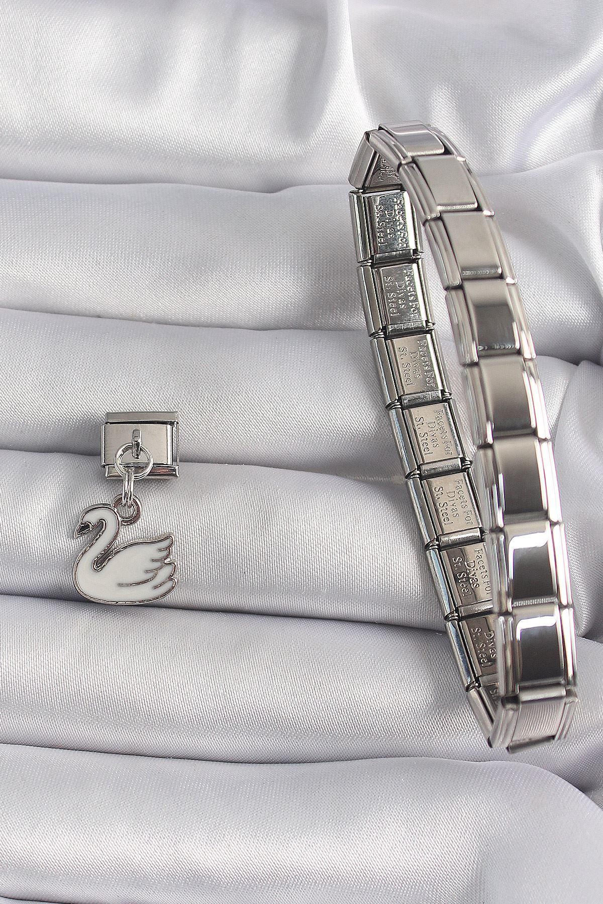 316L Çelik Gümüş Renk Sallantı Beyaz Kuğu Model Nomination Charm - TJ-BC1160