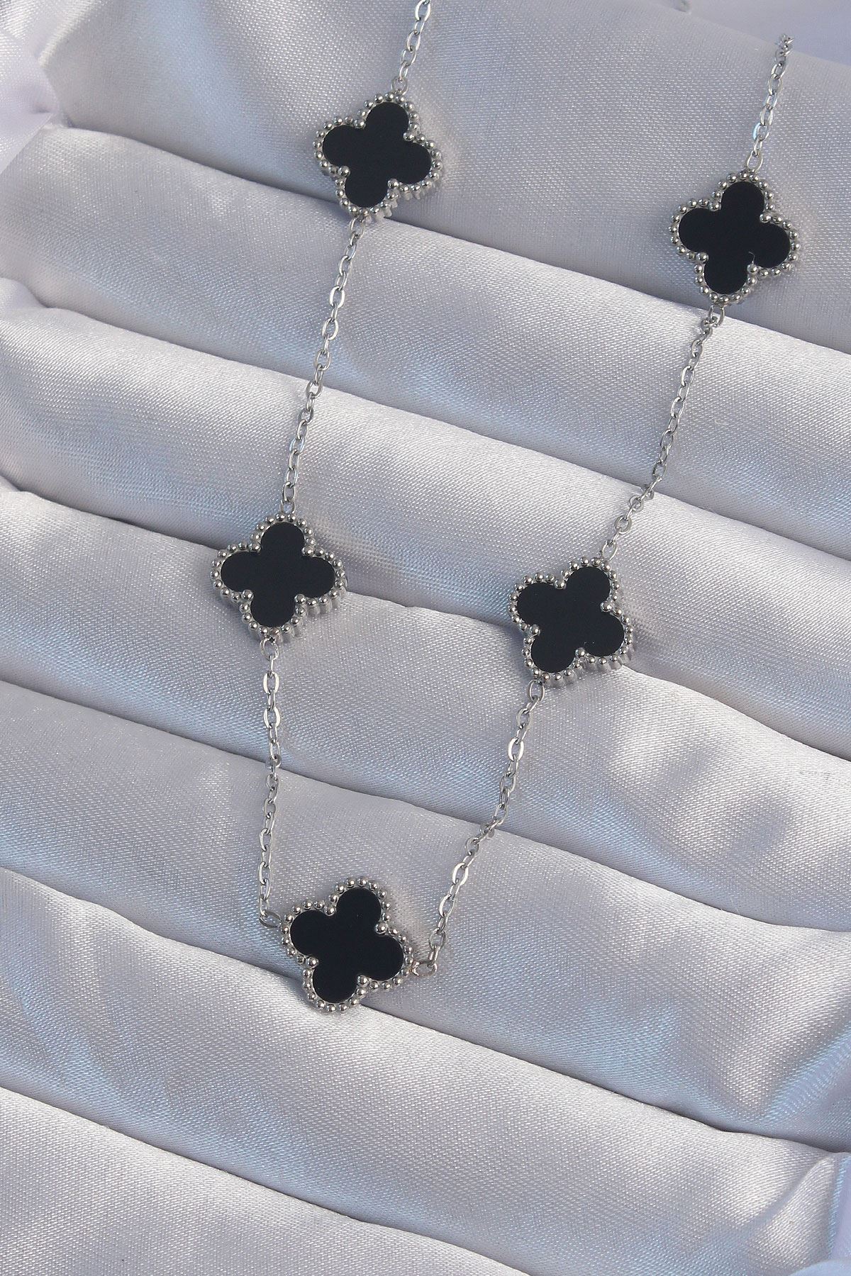 316L Çelik Gümüş Renk Siyah Mineli Yonca Kolye - TJ-BKO8997