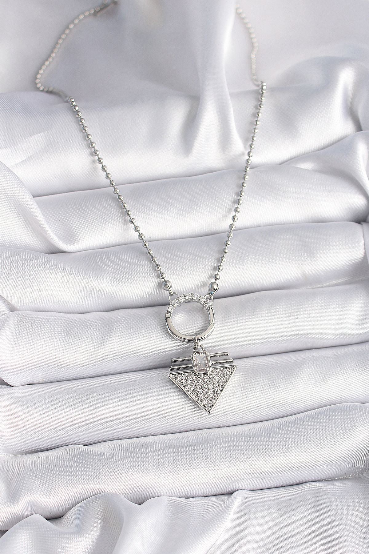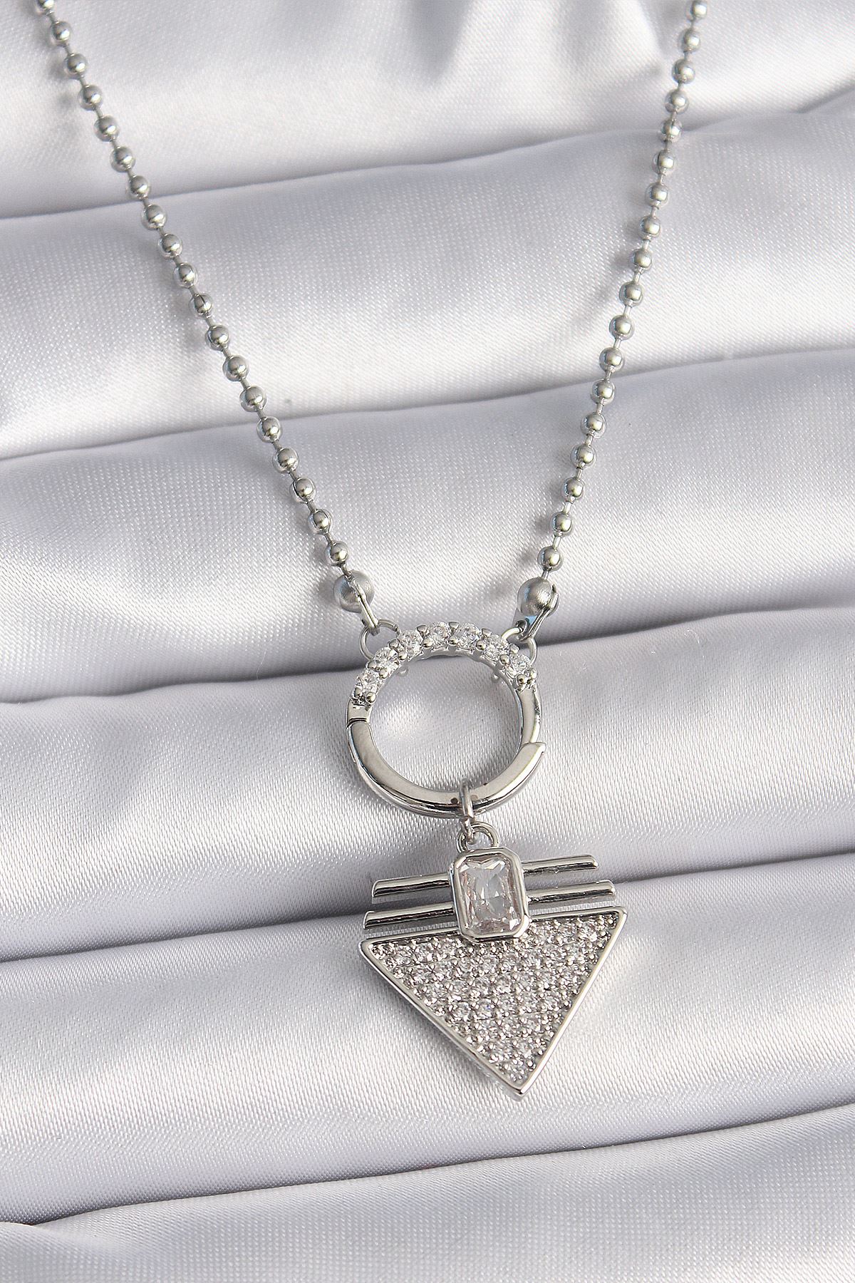 316L Çelik Gümüş Renk Topçuk Zincir Zirkon Taşlı Üçgen Model Kadın Kolye - TJ-BKO9574