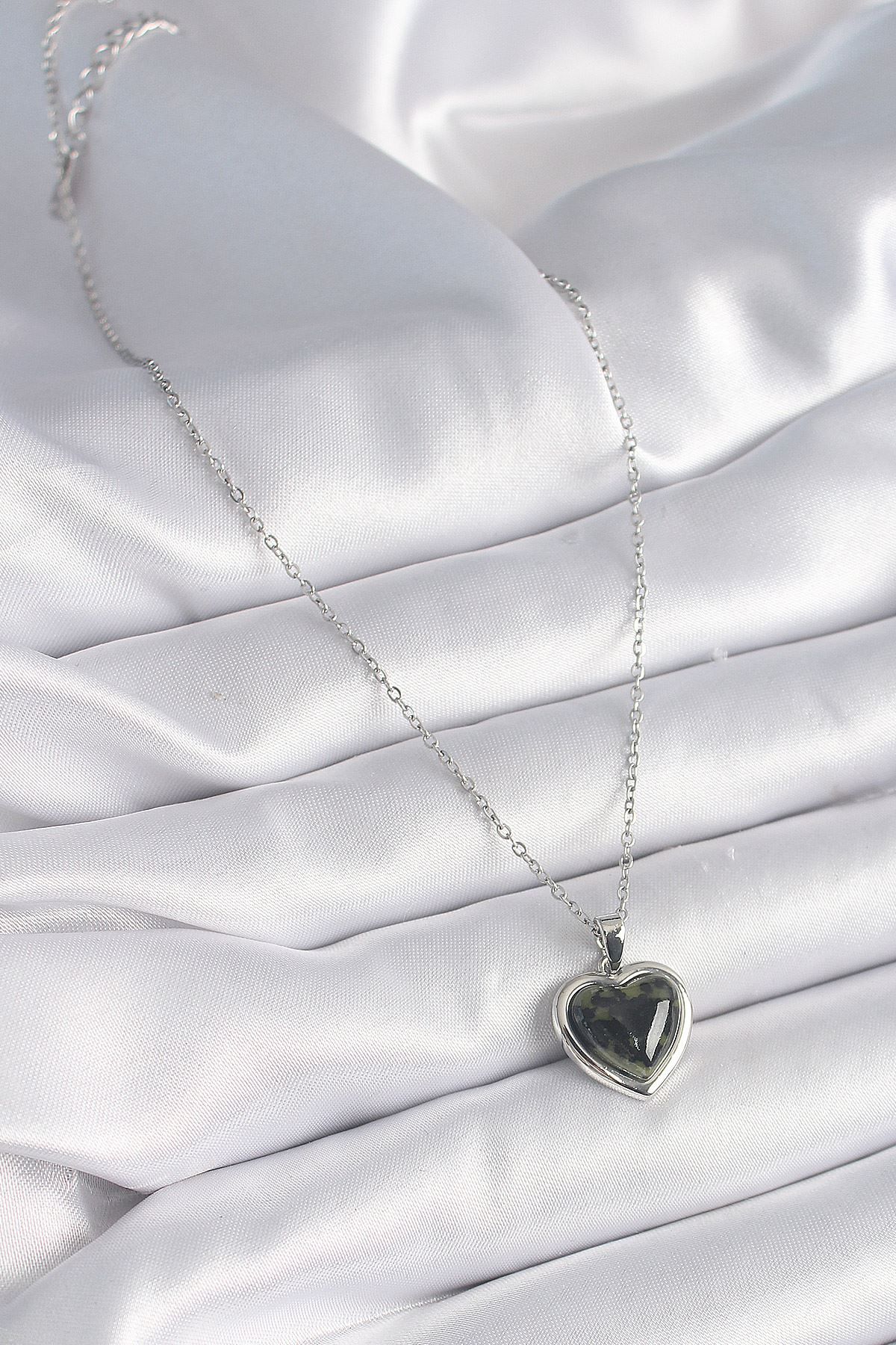 316L Çelik Gümüş Renk Yeşil Mineli Kalp Model Kadın Kolye - TJ-BKO9526