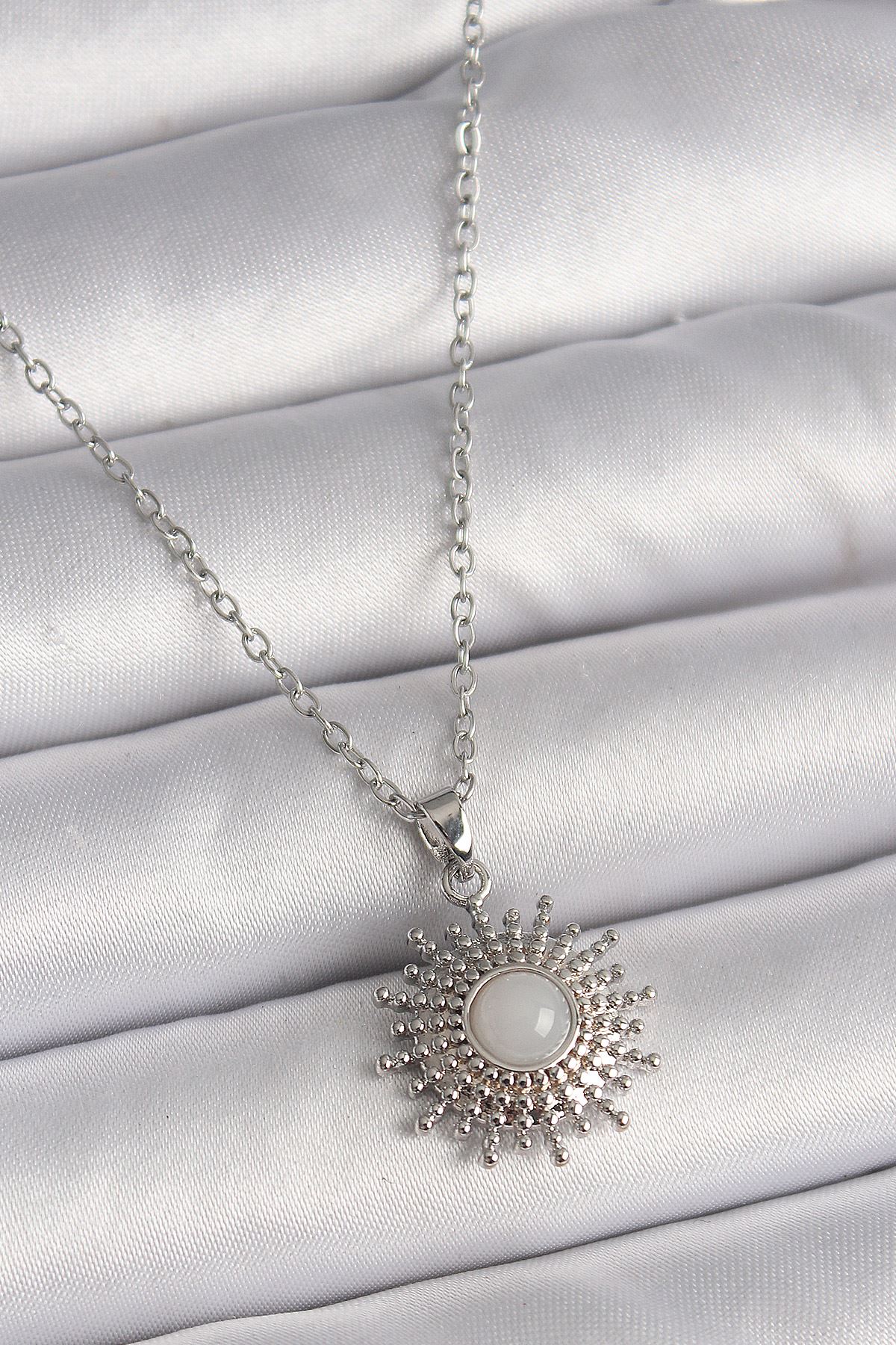 316L Çelik Gümüş Renk Zincir Beyaz Mineli Güneş Model Kadın Kolye - TJ-BKO9719