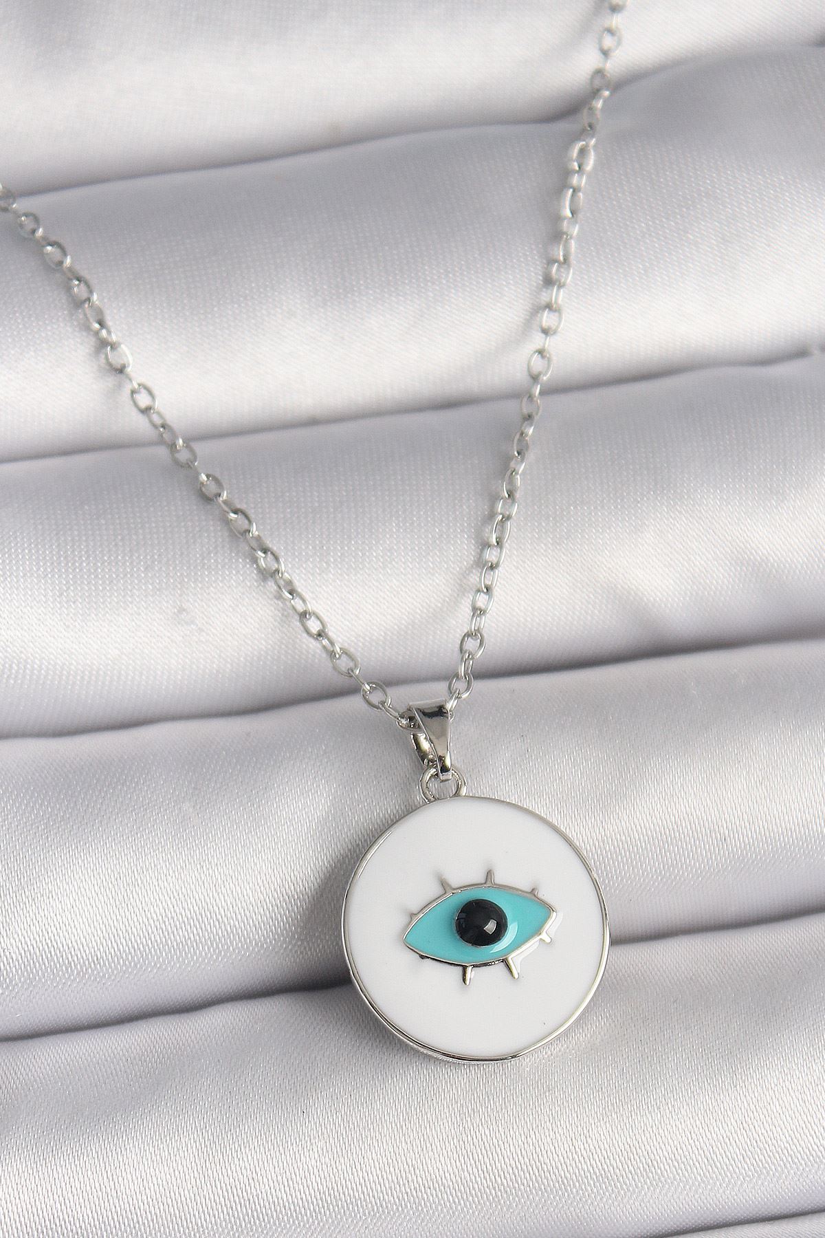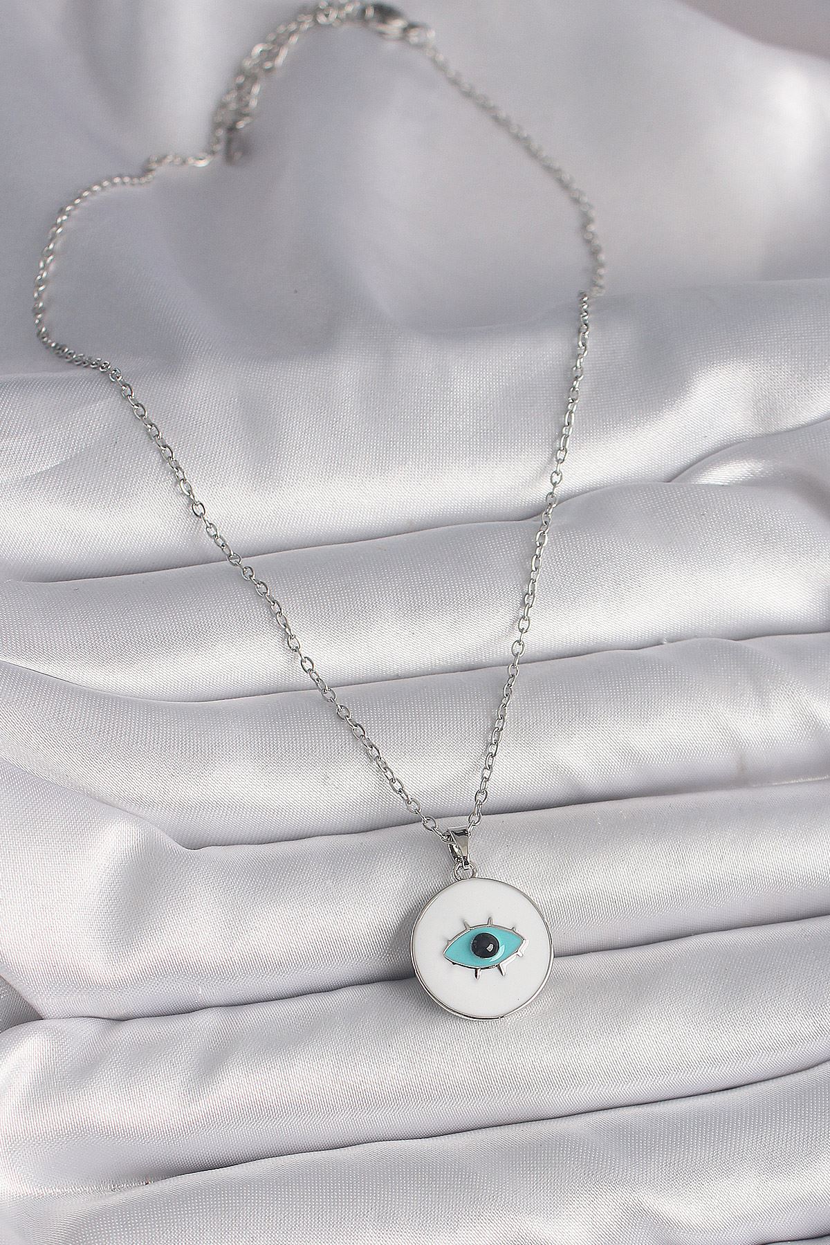 316L Çelik Gümüş Renk Zincir Beyaz Mineli Turkuaz Göz İşleme Model Kadın Kolye - TJ-BKO9729