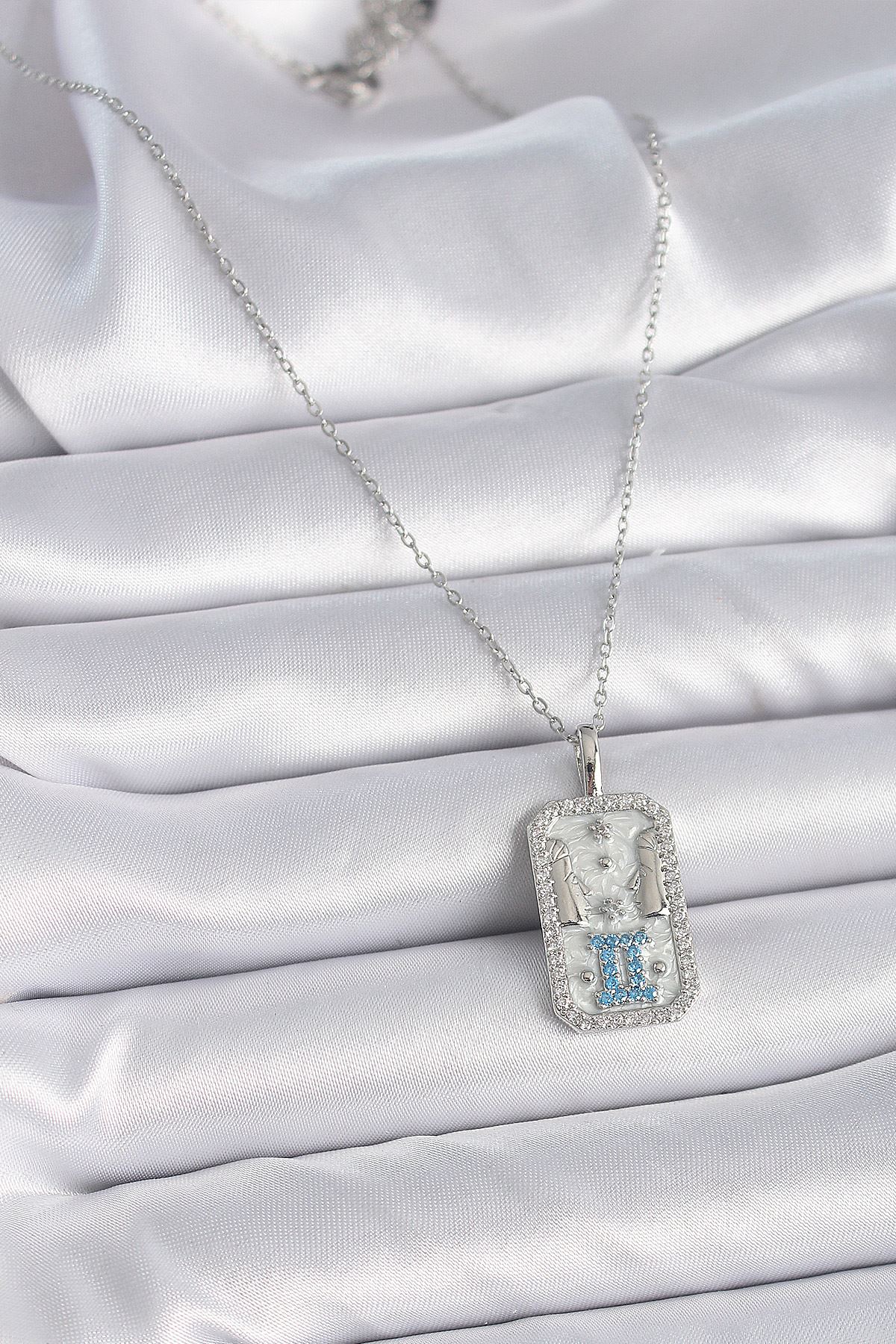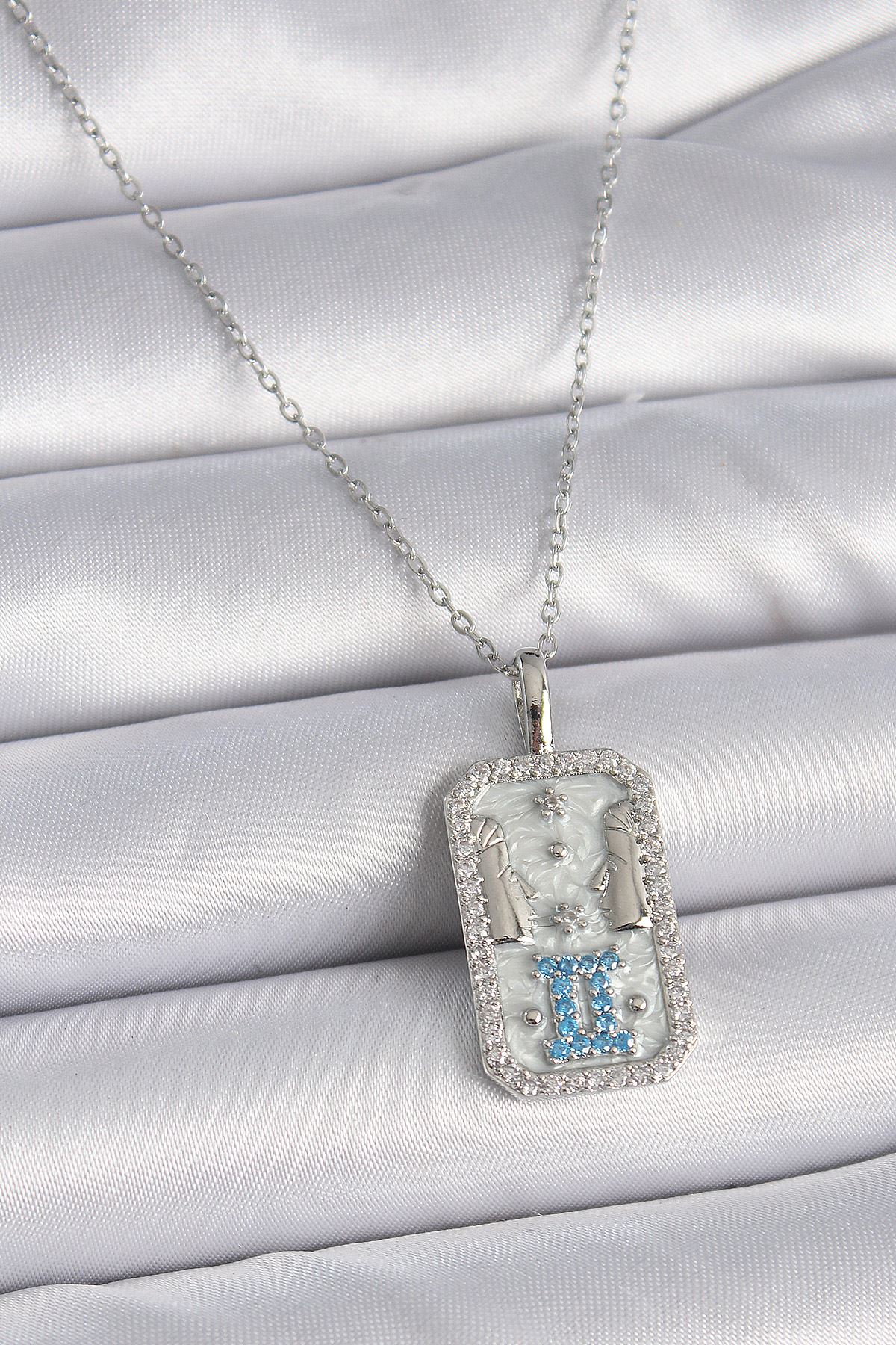 316L Çelik Gümüş Renk Zincir İkizler Burcu Zirkon Taşlı Kadın Kolye - TJ-BKO9446