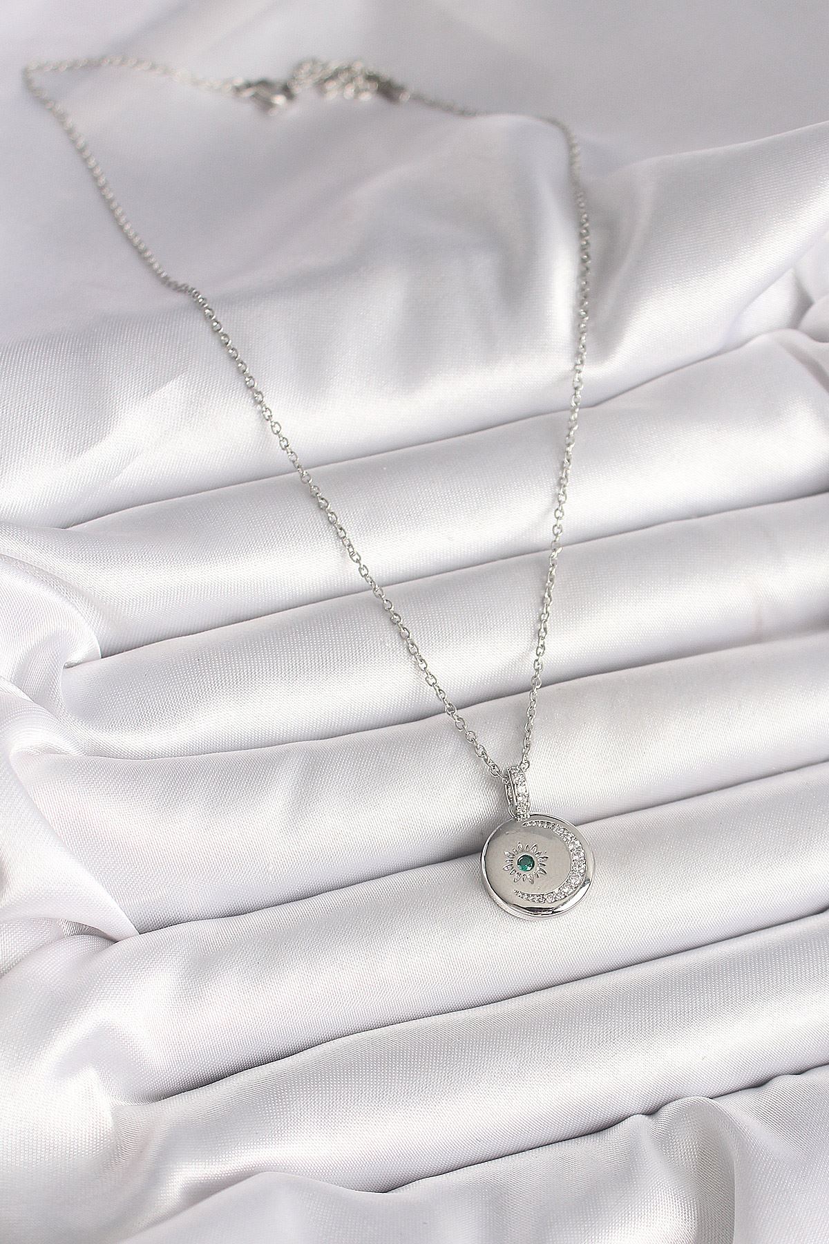 316L Çelik Gümüş Renk Zincir Madalyon Zirkon Taşlı İşlemeli Hilal Yıldız Model Kadın Kolye - TJ-BKO9953