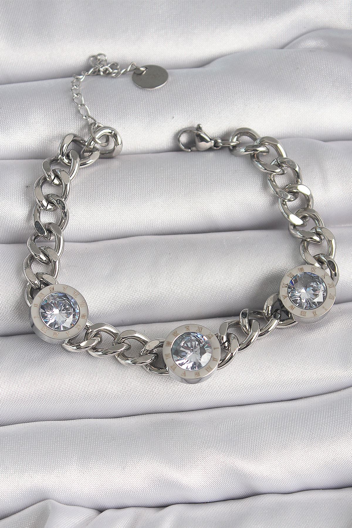 316L Çelik Gümüş Renk Zincir Model Zirkon Taşlı İşleme Detaylı Kadın Bileklik - TJ-BB6651