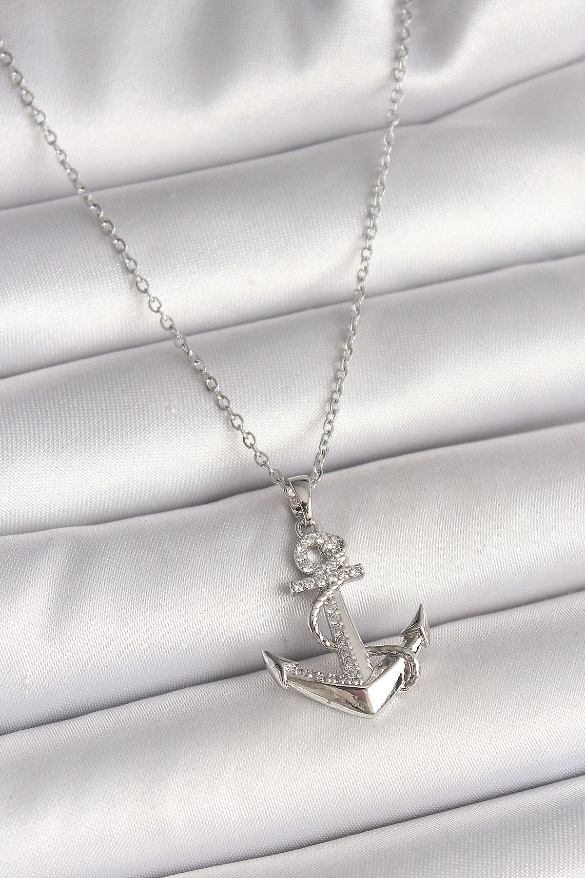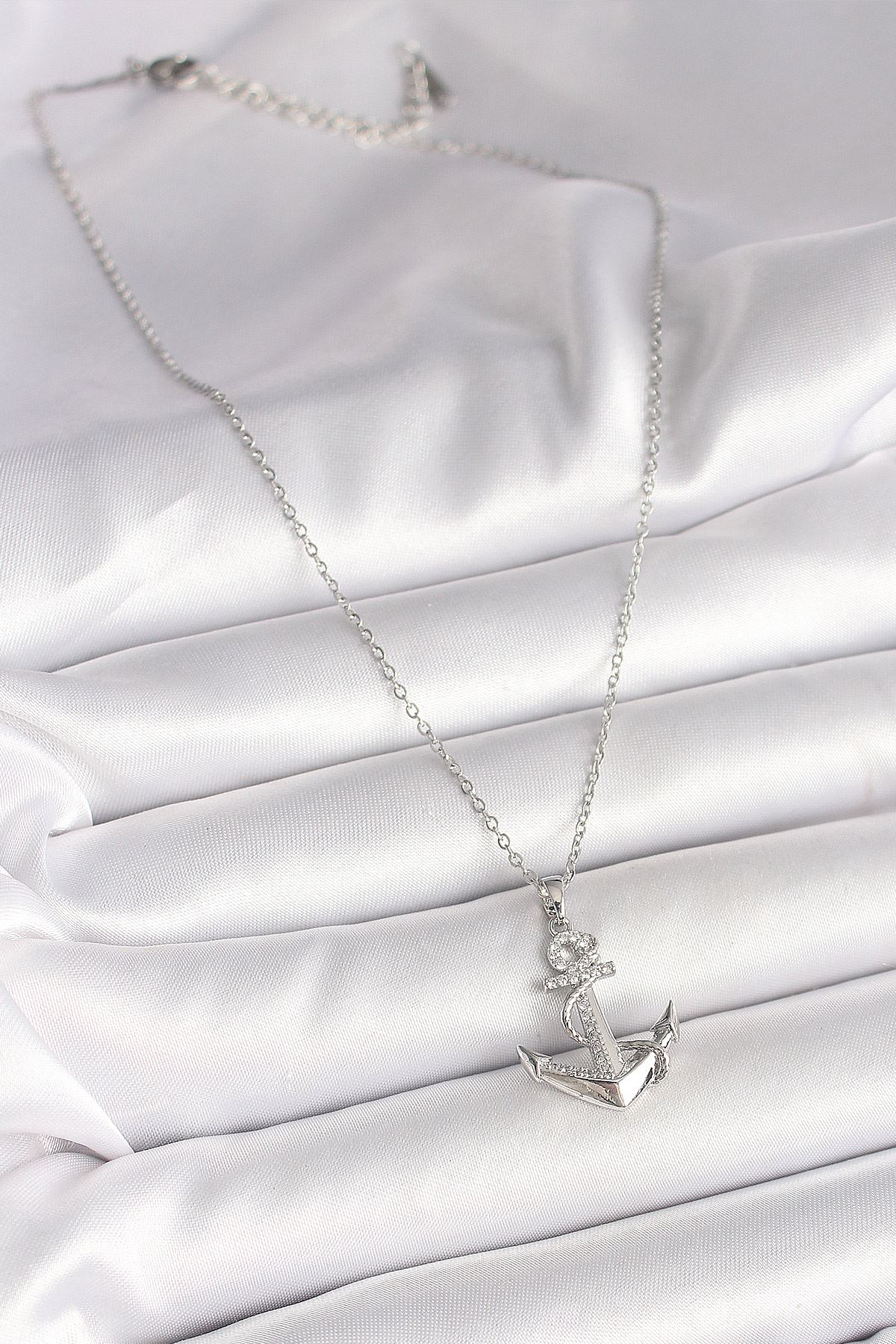 316L Çelik Gümüş Renk Zincir Zirkon Taş Detaylı Çapa Model Kadın Kolye - TJ-BKO9951