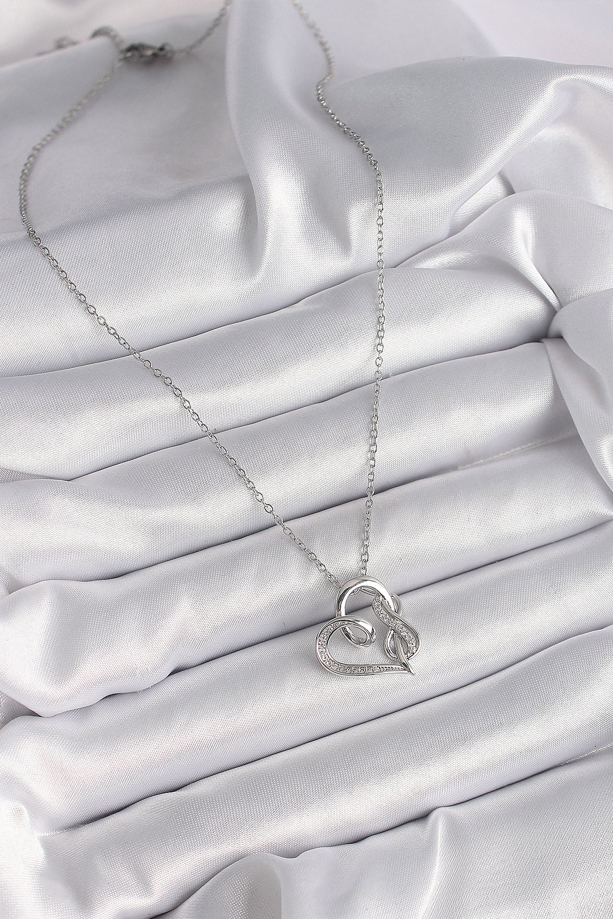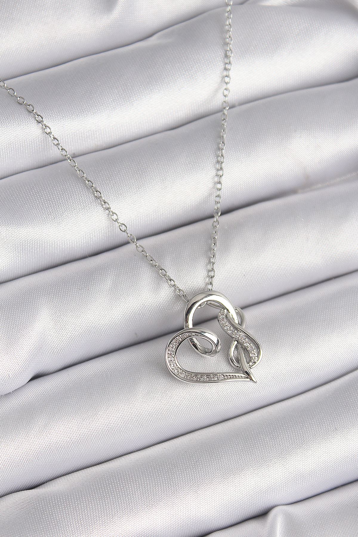 316L Çelik Gümüş Renk Zincir Zirkon Taş Detaylı Kalp Model Sonsuzluk Detay Kadın Kolye - TJ-BKO9584